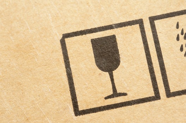 "Glass icon stamped on a brown cardboard carton used for packaging indicating fragile or breakable contents"