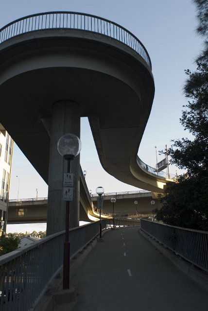 "U-turn turnaround on concrete overpass structure viewed from below against clear blue sky"