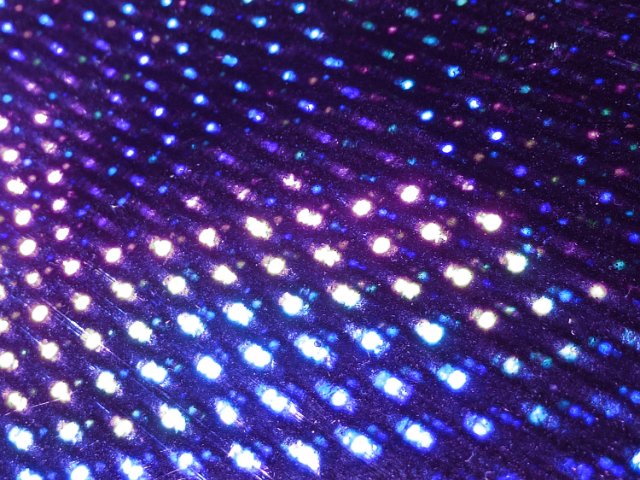 "reflecting blue and purple highlights on a metallic surface"