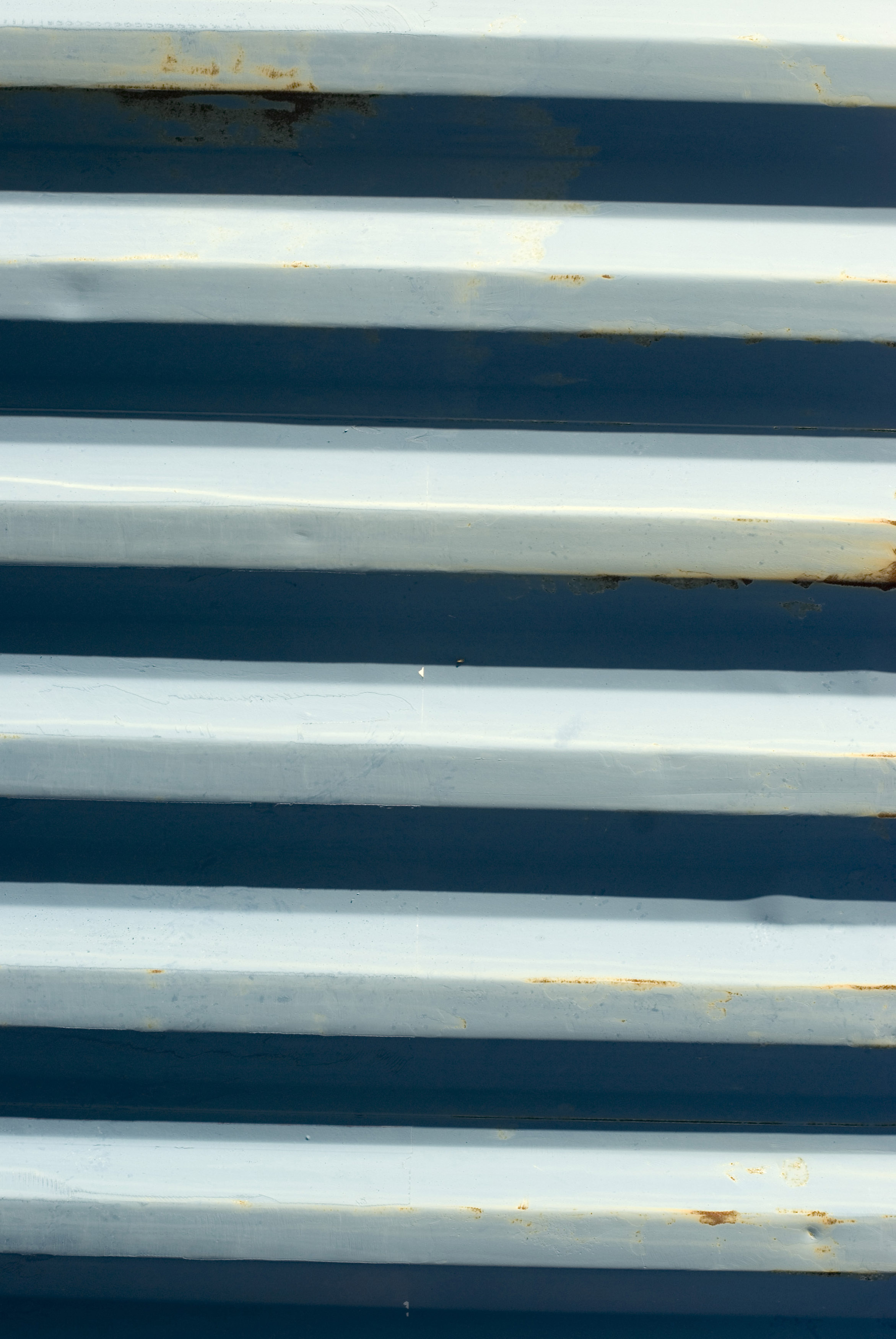 "A close up of an aged blue and white corrugated iron roofing sheet."