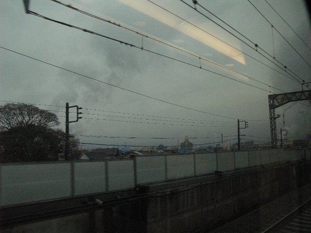 "reflections of light in a train window with a grey industrialised landscape outside"