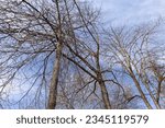 "Low angle view of a copse of tall leafless deciduous trees with moss covered bark reaching for the blue sky"
