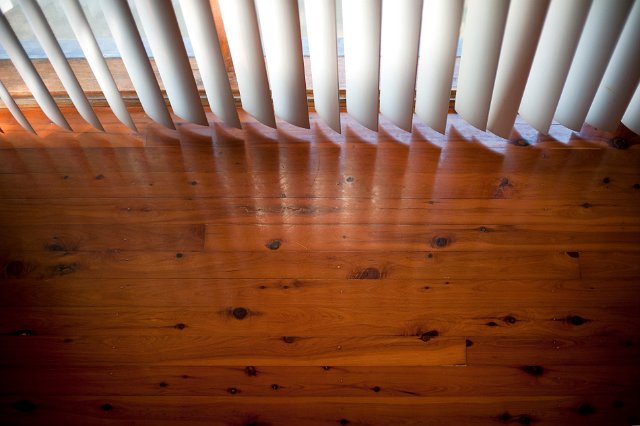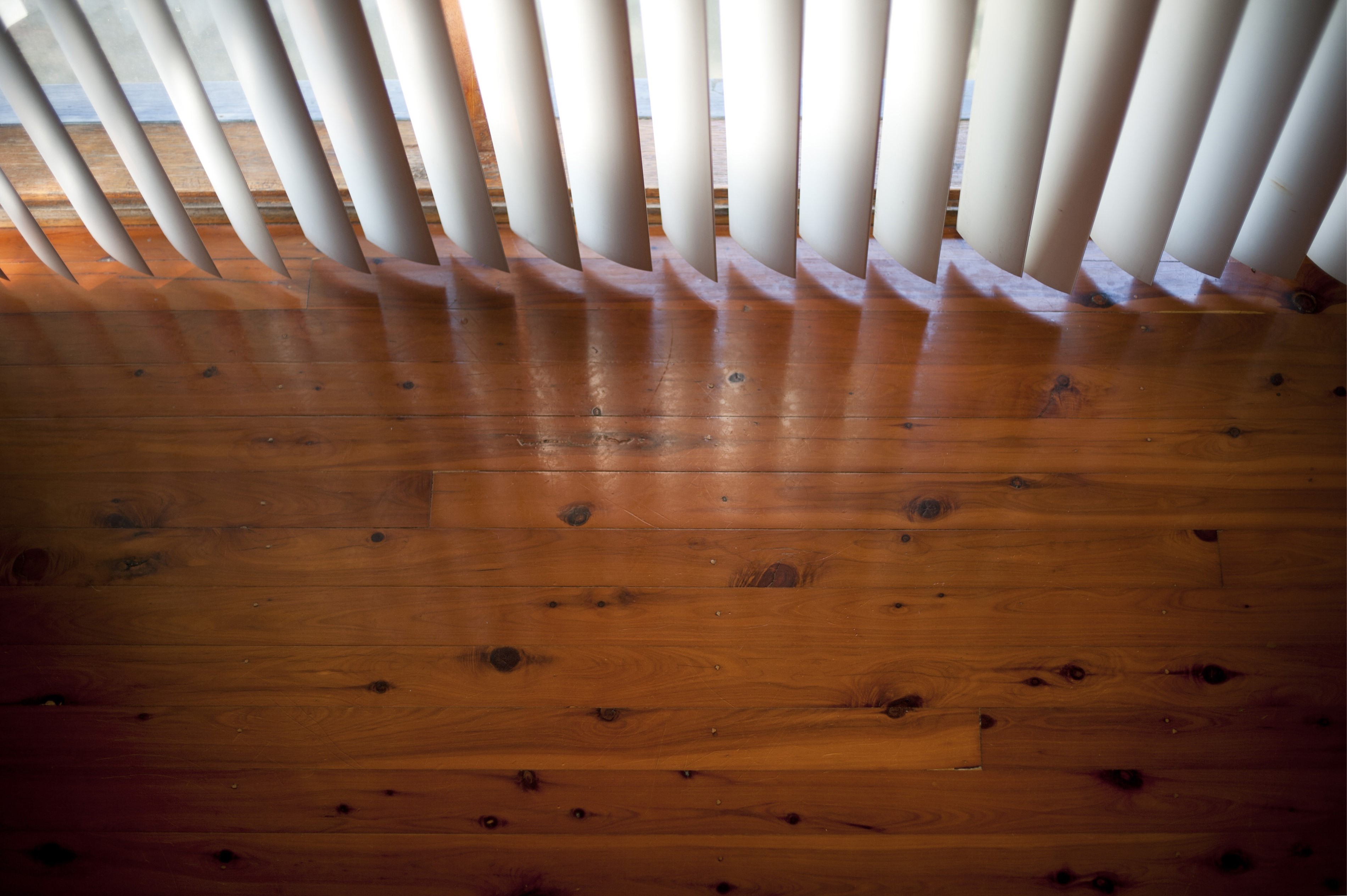 "Stained and sealed wooden hardwood interior flooring, high angle view with a vertical blind"