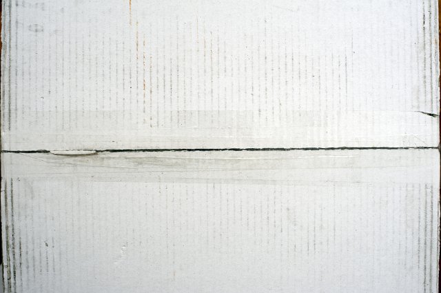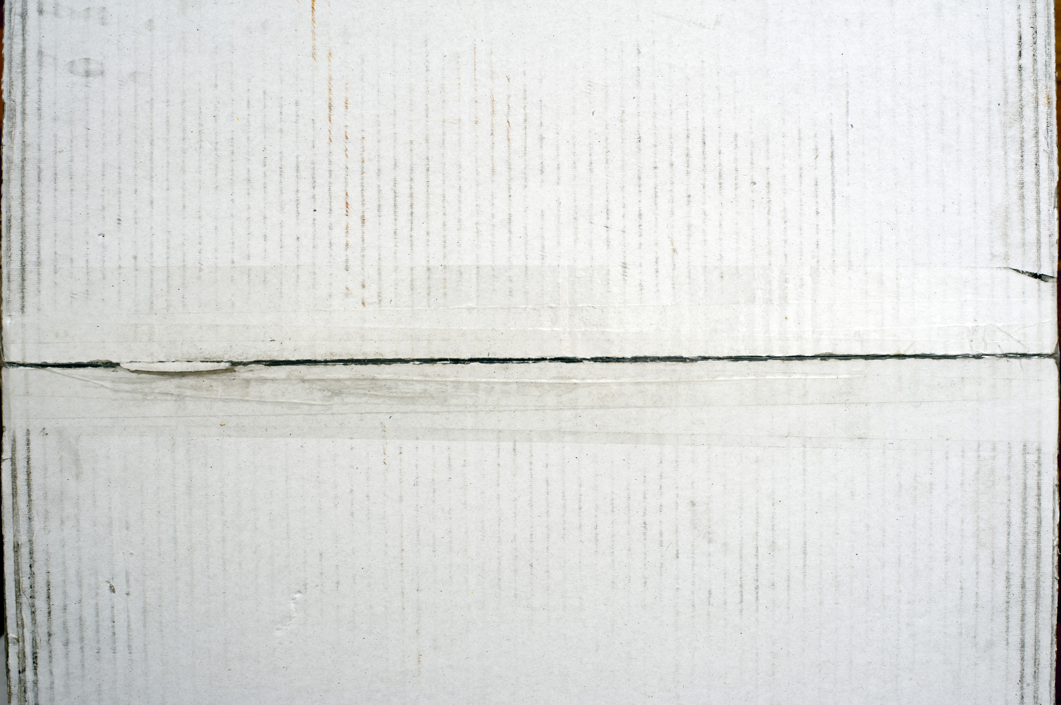 "White cardboard background showing the bottom of a carton with the center join sealed with tape, full frame view"