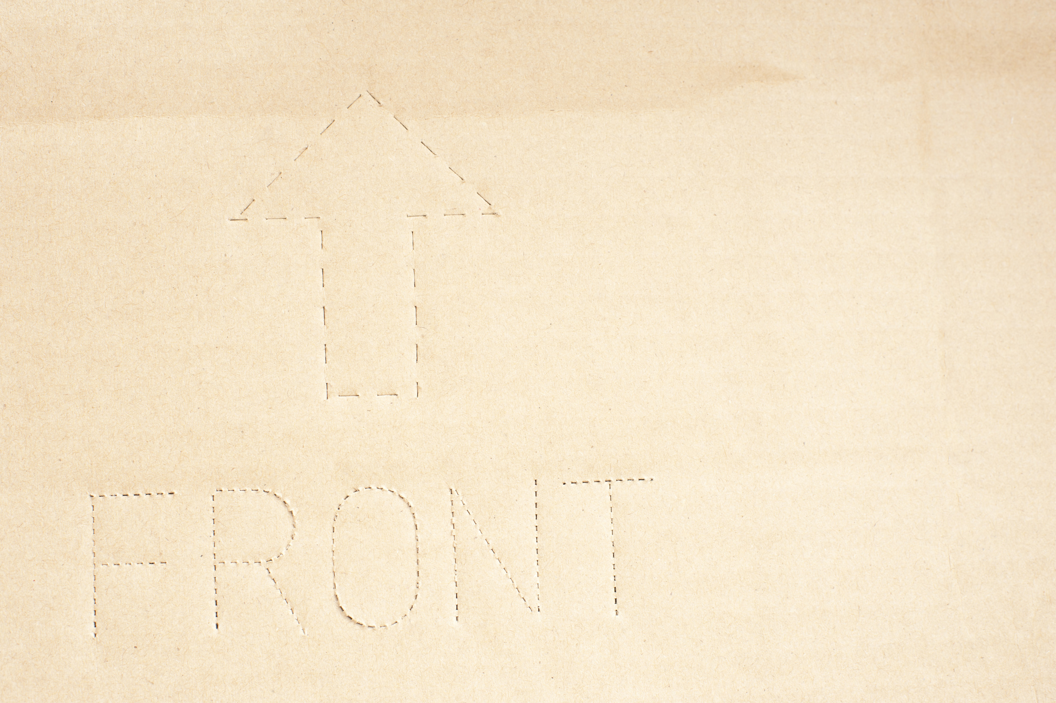 "Close up background of cardboard box wall with perforated text describing front with upward arrow"