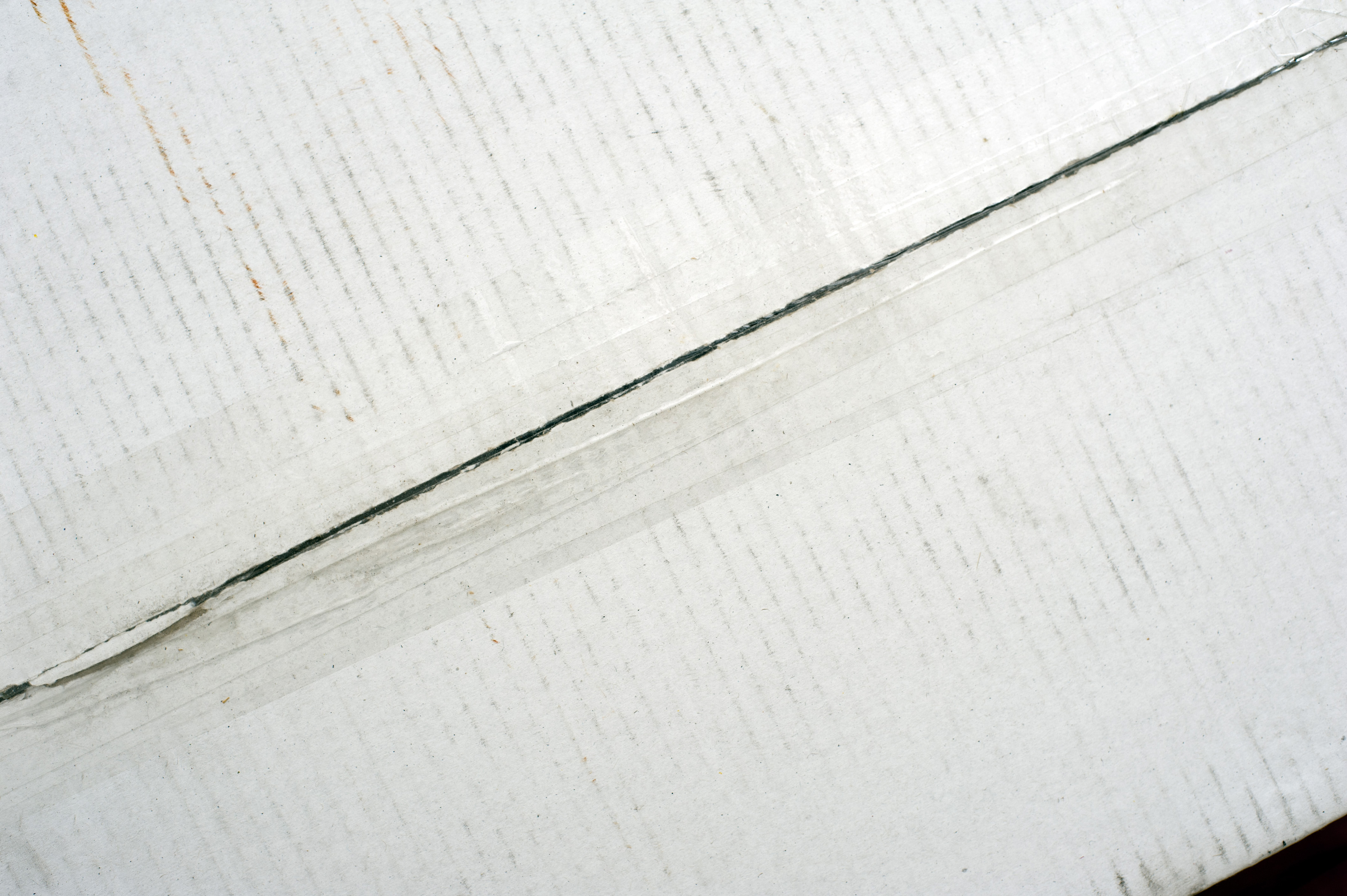"Packaging tape on a white carton sealing the two flaps for transport, close up view from above"