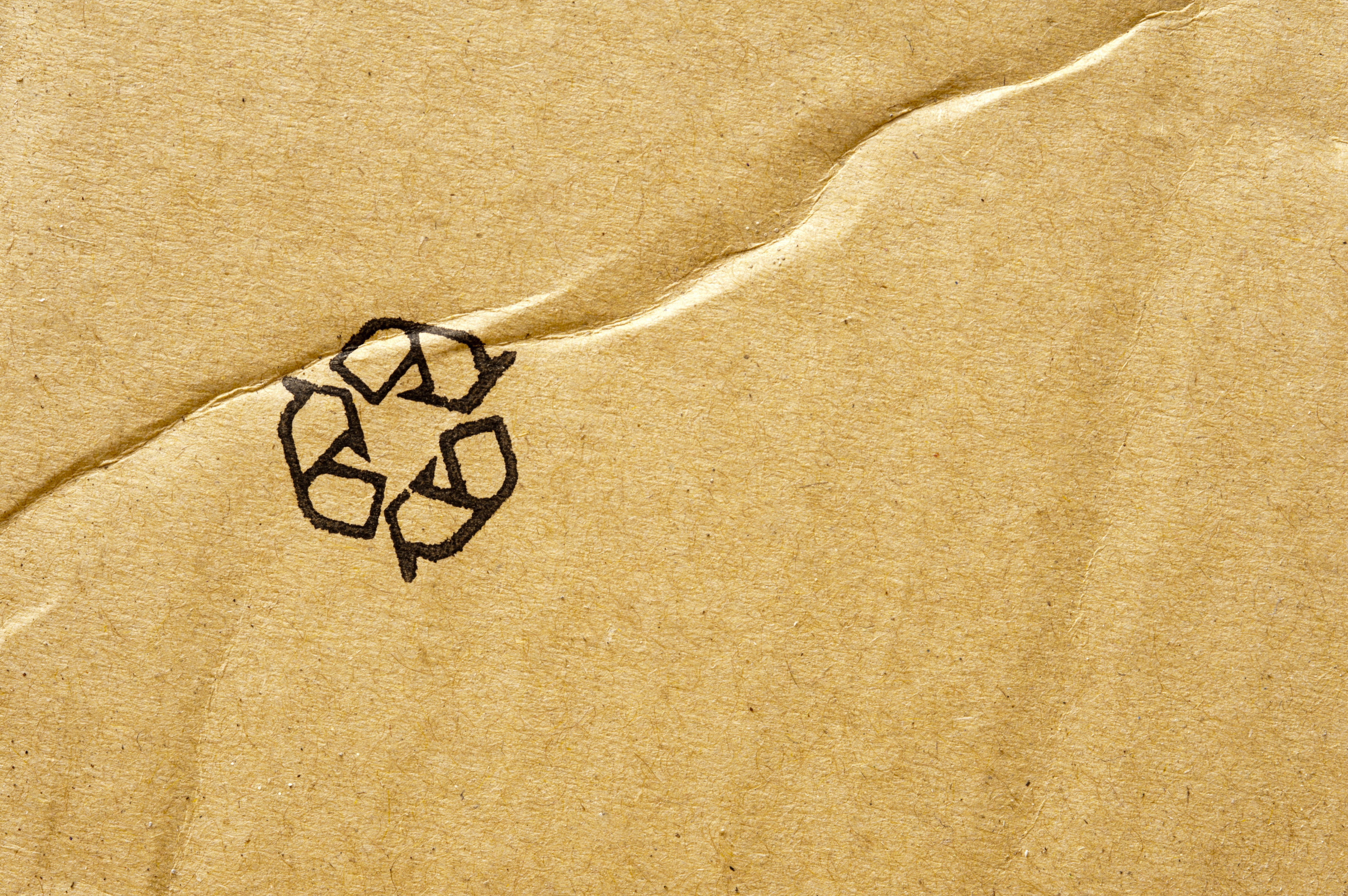 "Recycle background of a black icon stamped in the corner of brown cardboard packaging with copy space viewed from above"