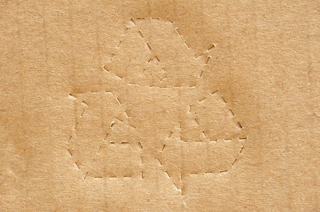 "Perforated stamped recycling icon on a brown cardboard box or pacing carton on a close up full frame view in an environmental concept"