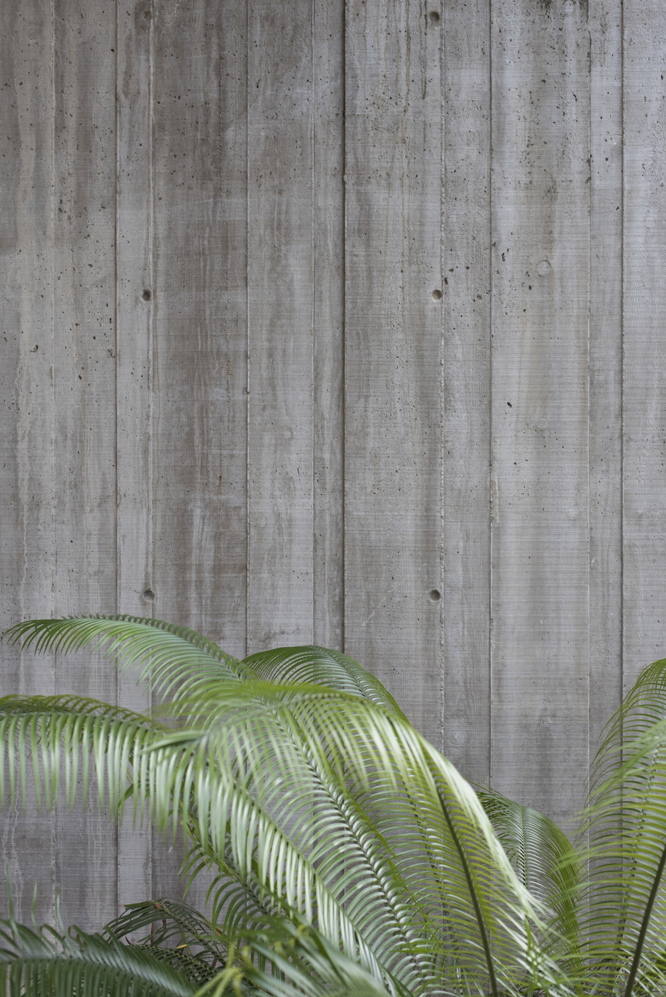 "Fronds of a green palm tree against a concrete wall with copy space in a close up full frame view"