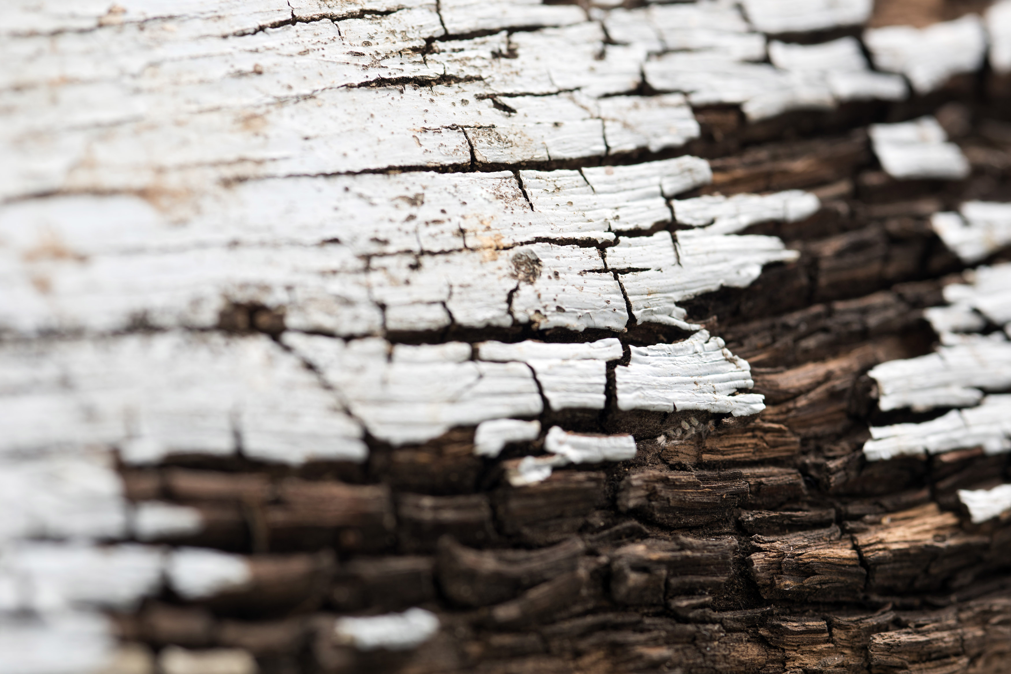 "Close up texture of old rotting painted wood decaying from moisture and damp with selective focus in a full frame view"