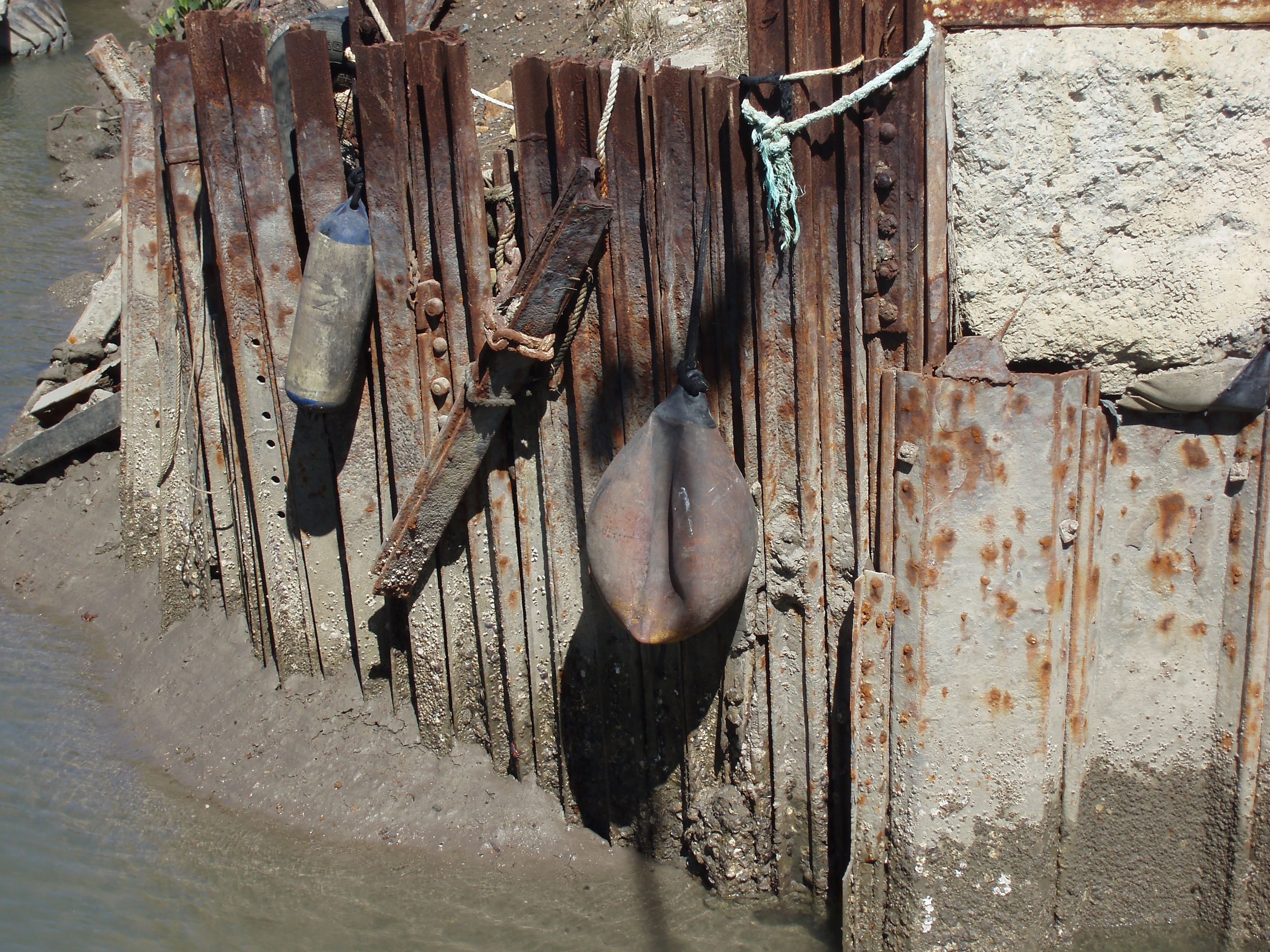 "a rusty dock quayside made from metal pilings"