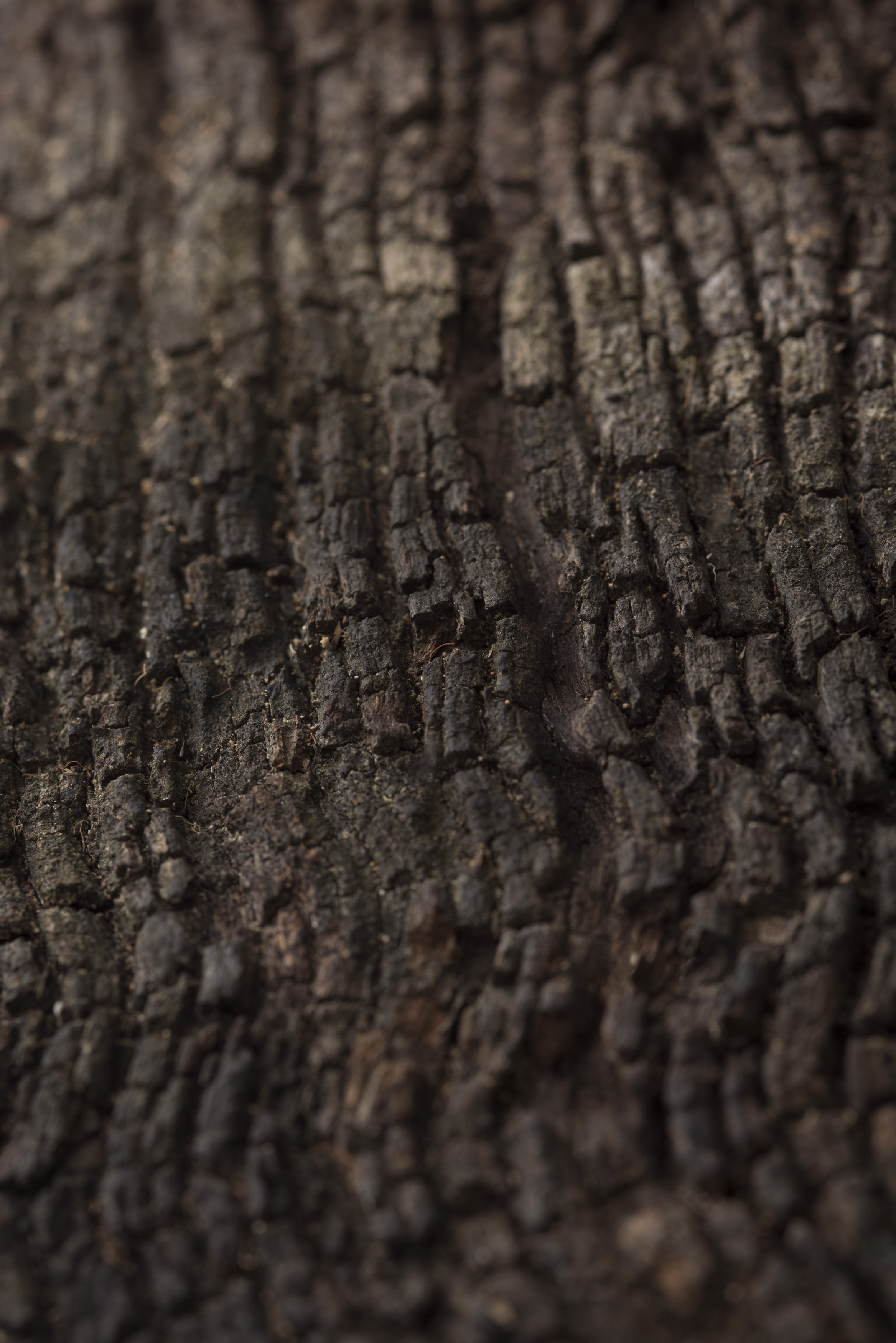 "Decaying burnt wooden surface with cracks in close-up. Dark brown background in selective focus and full frame"