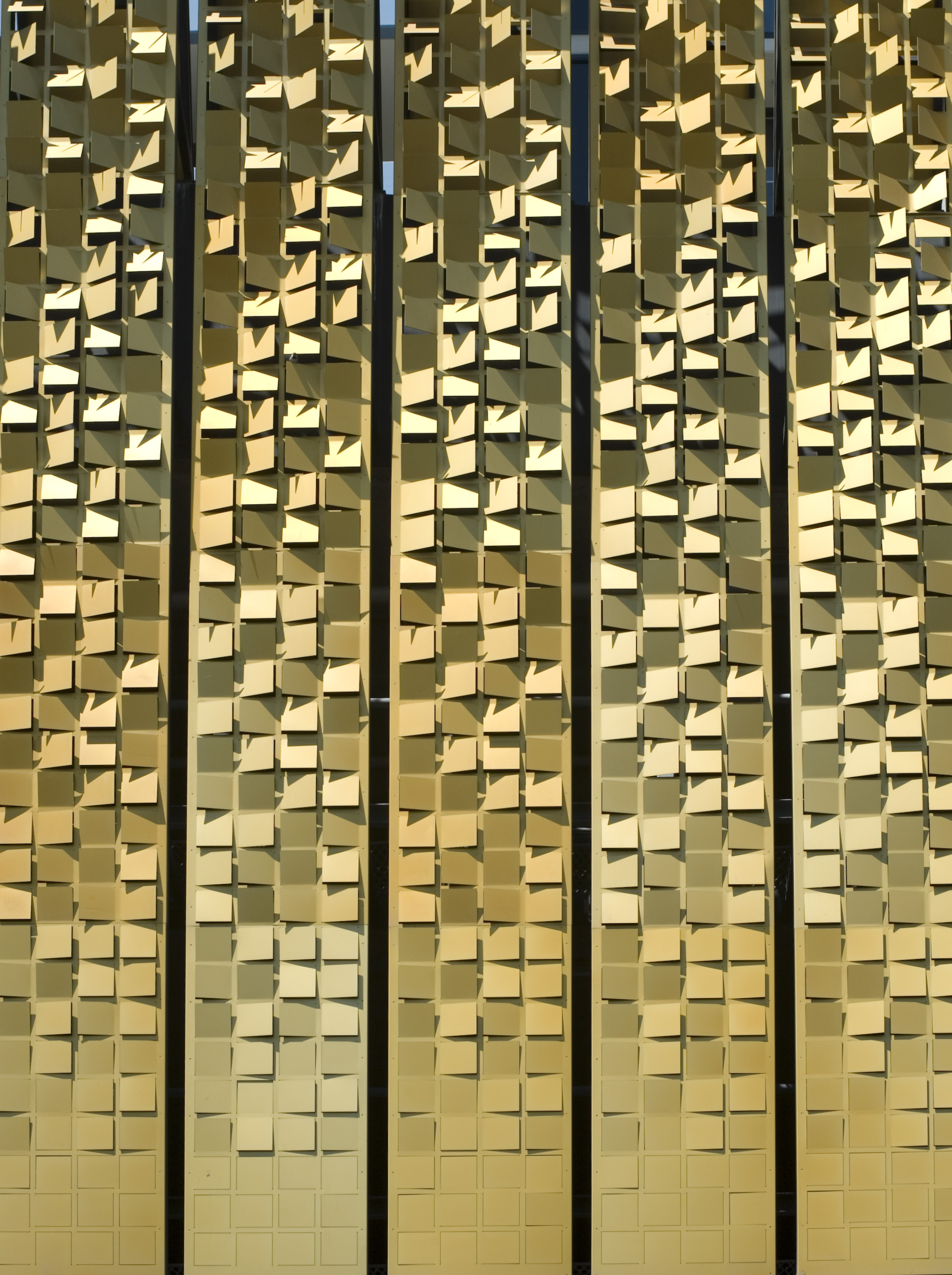 "gold colored architectural metal screen clading cut in square shapes"