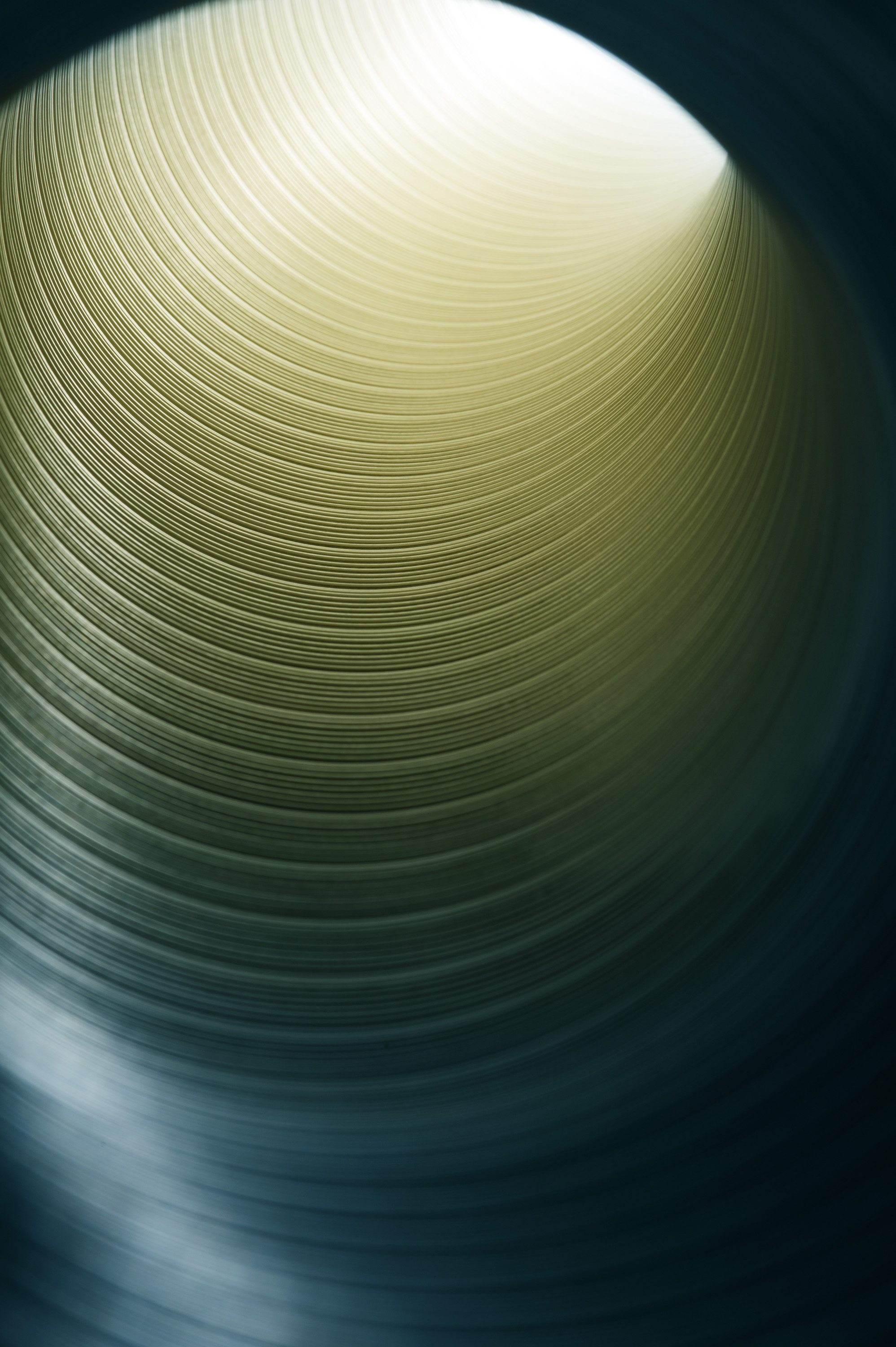 "yellow light glowing at the end of a silver metal pipe or tube"