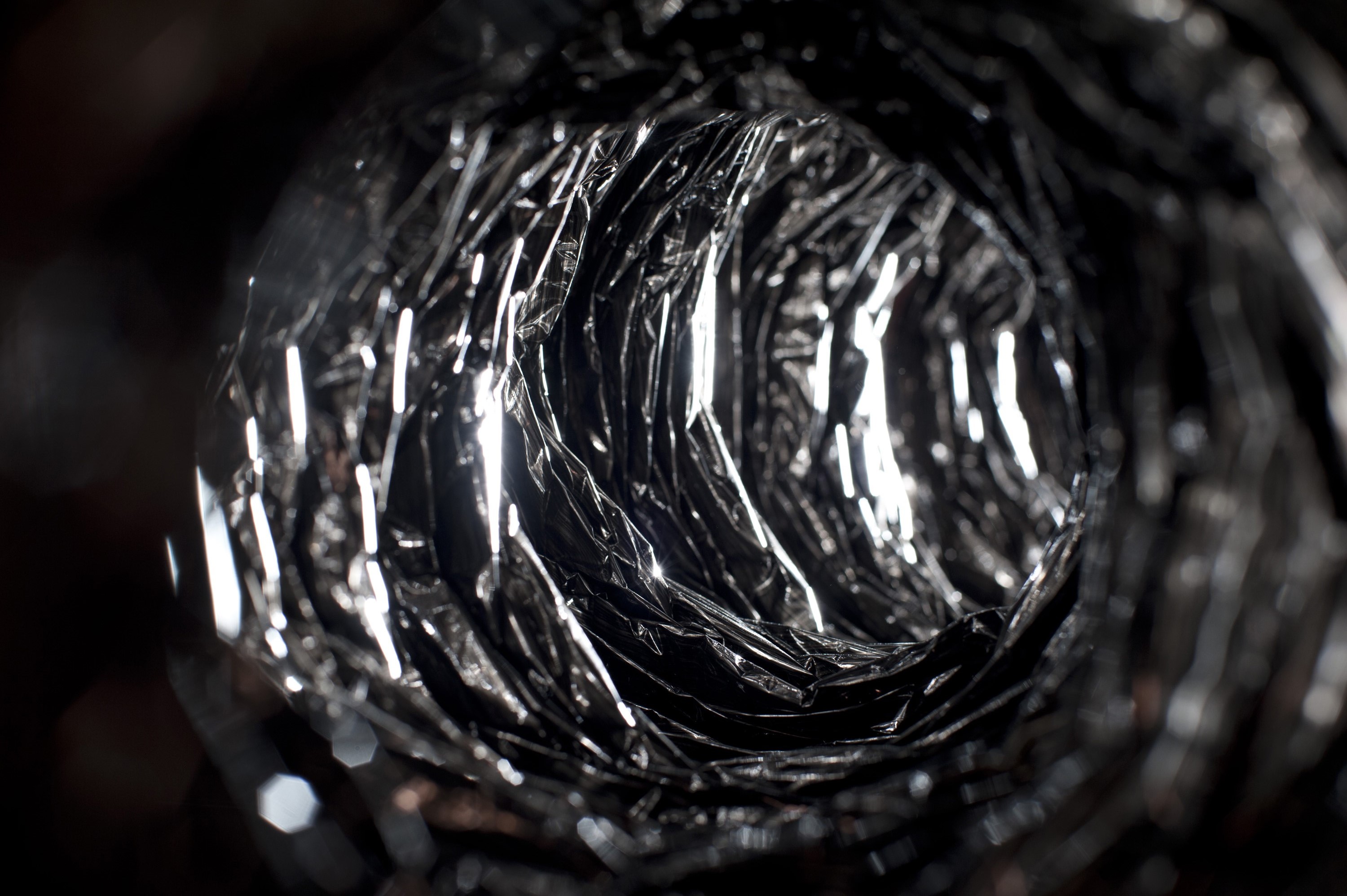 "a view down a metal foil duct with light at the end"
