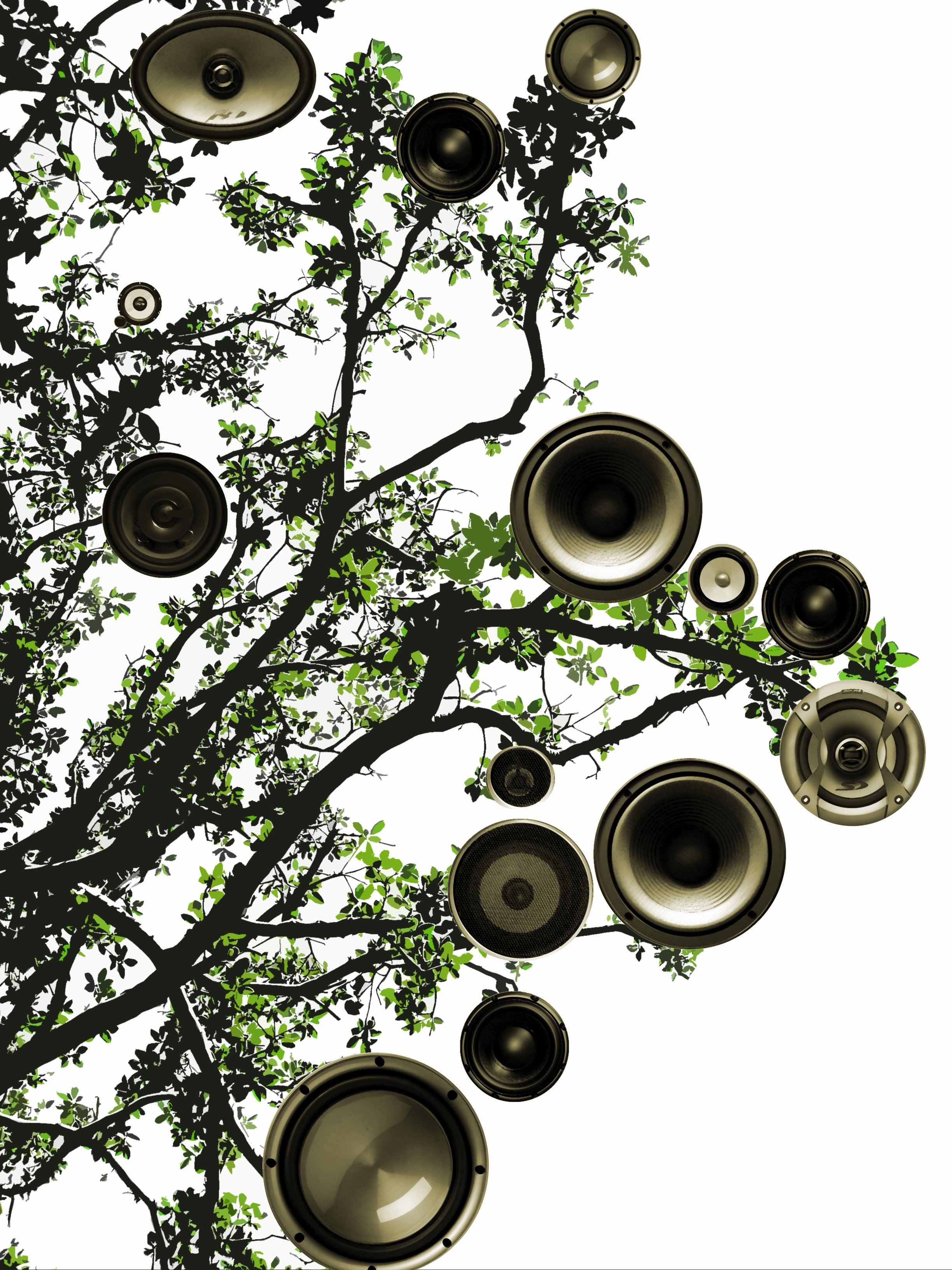 "graphic tree and speaker cones"