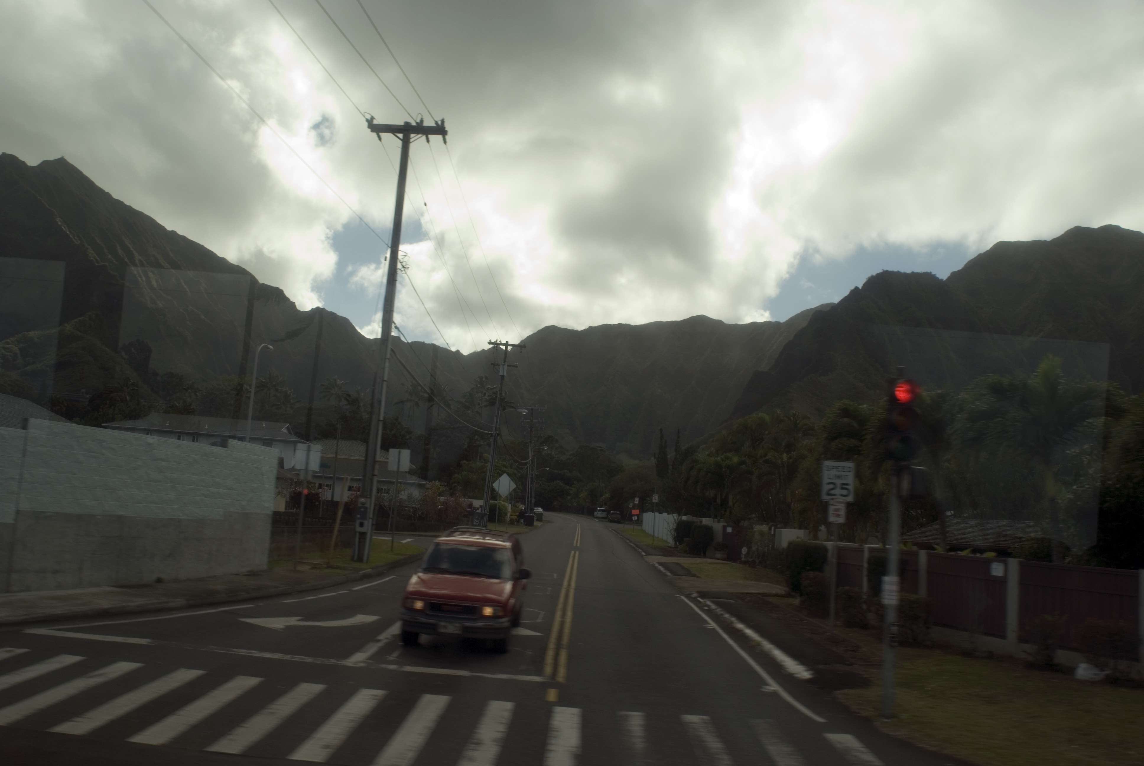 "abstract image of a car on a stormy day with an hawaiian mountain background"