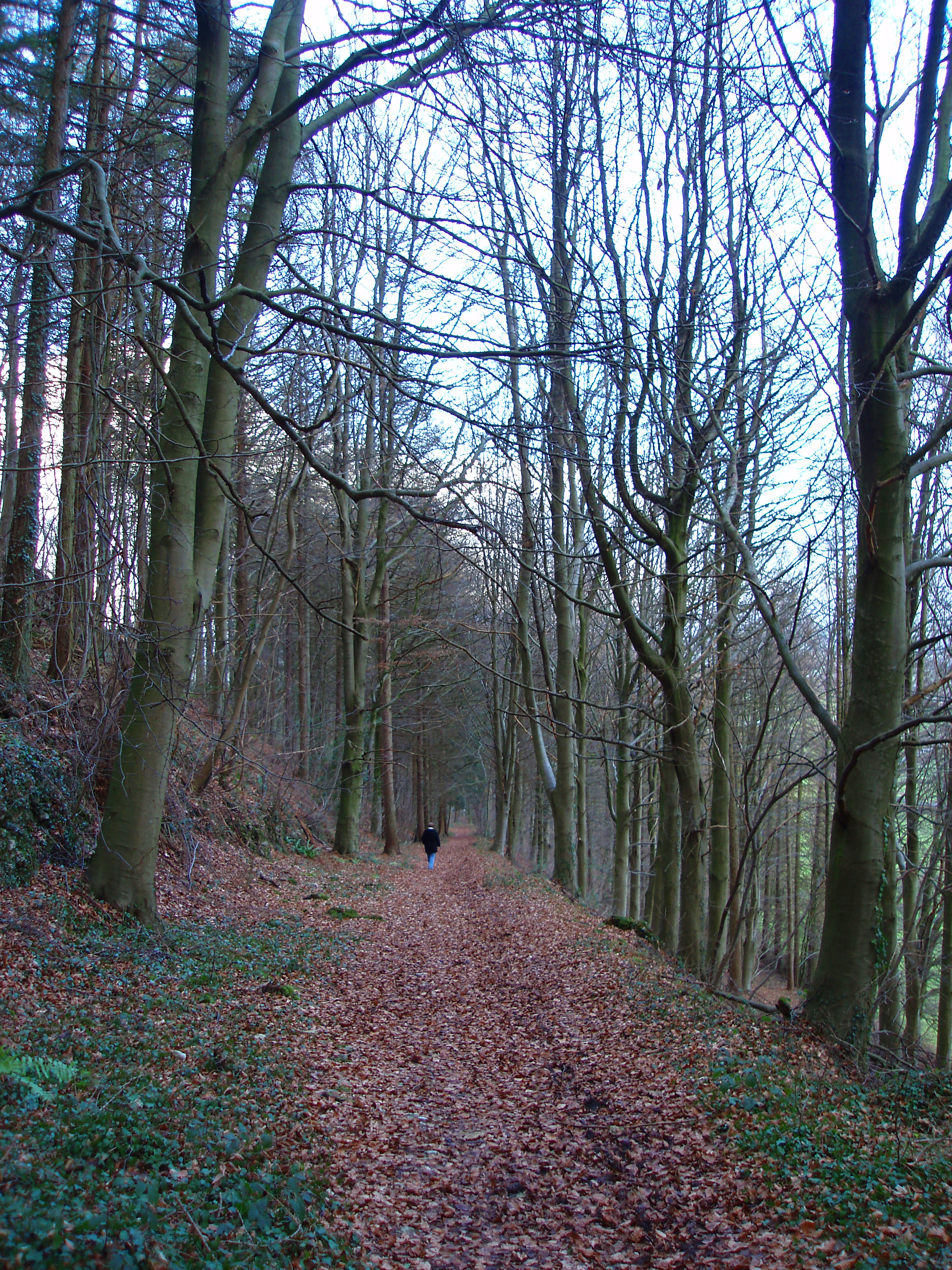 "a distant lone individual walking through a winter woodland"