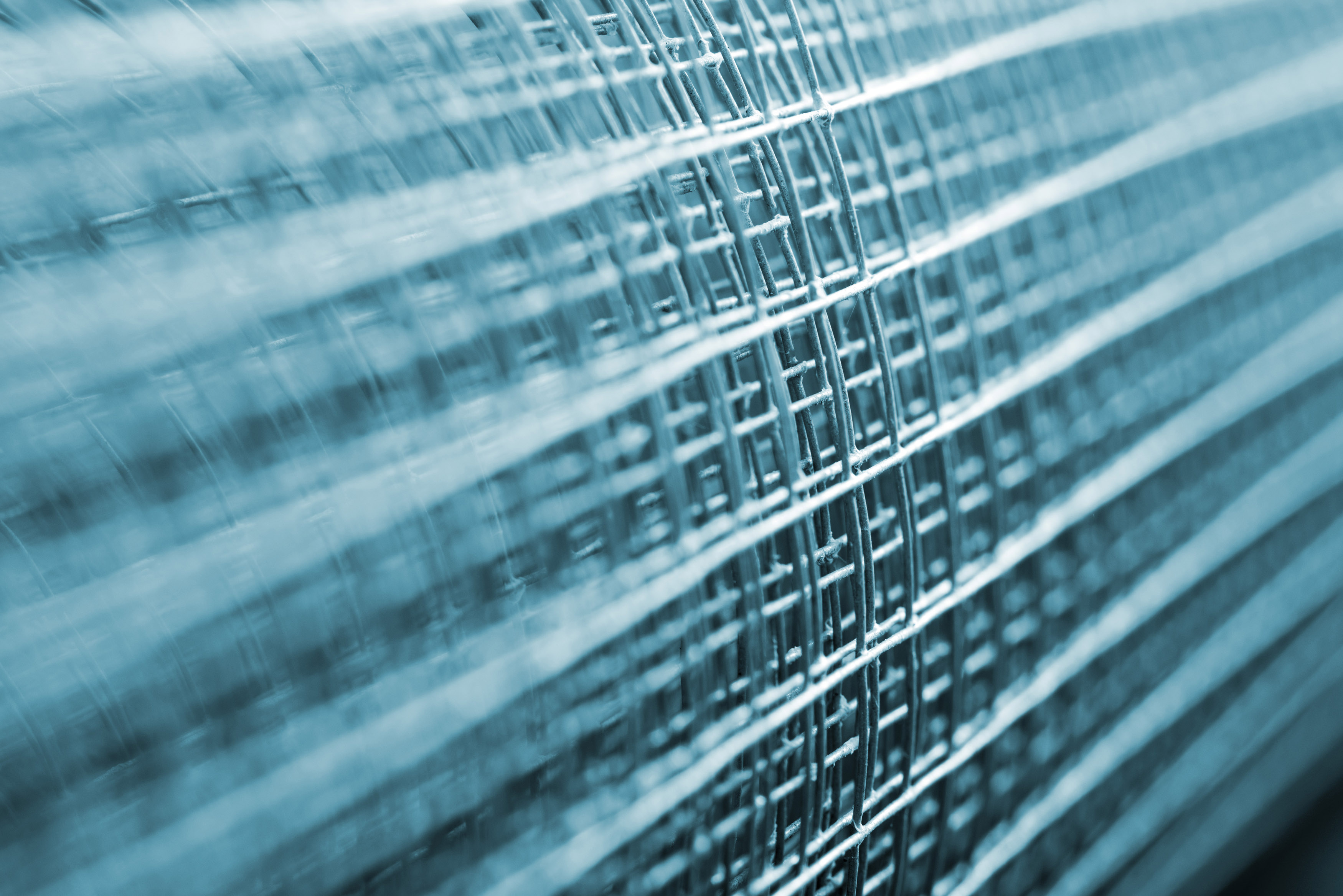 "Cyan colored roll of metal mesh viewed at an oblique angle with selective focus"