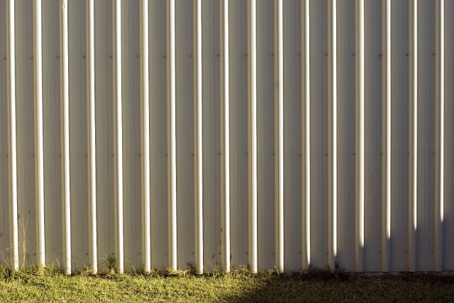 "A close up of a cream coloured corrugated iron shed wall and grass."