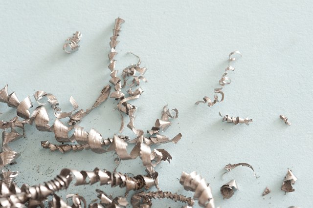 "Scattered industrial metal filings, shavings or swarf on a white background conceptual of production waste"