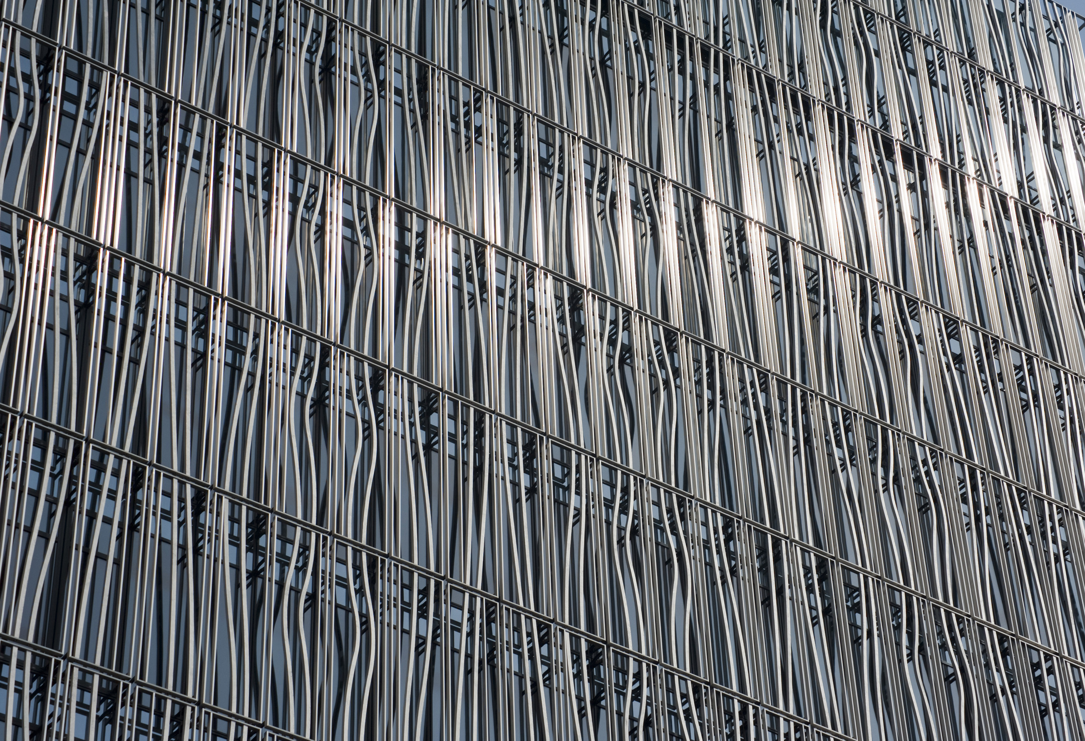 "Modern decorative wavy metal grid on a building facade viewed at an oblique angle full frame in an architectural background"