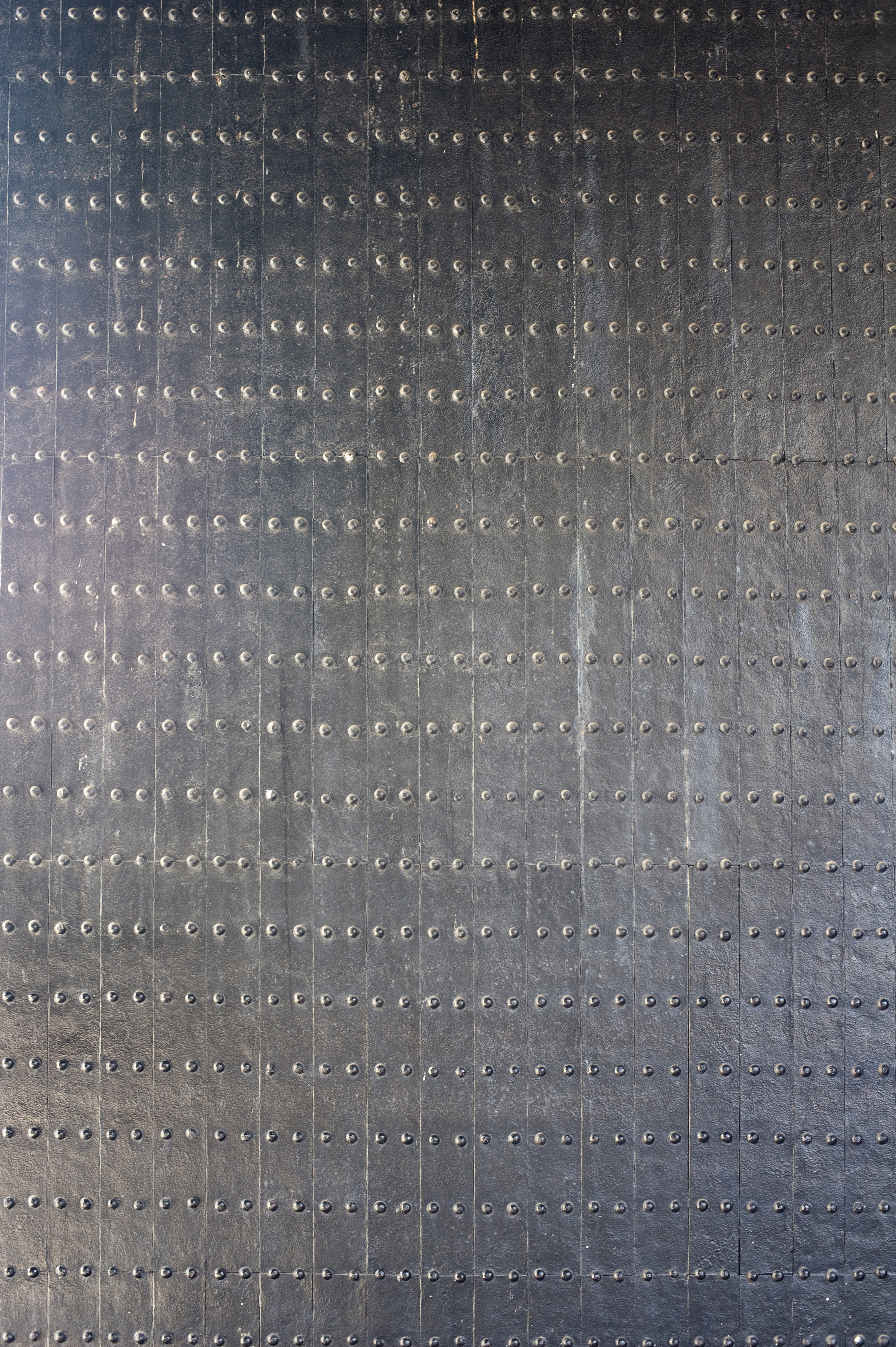 "An isolated shot of a plated steel door and rows of rivets."