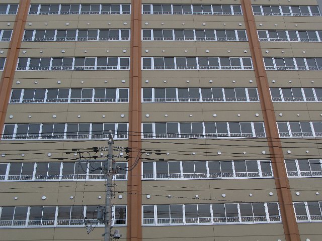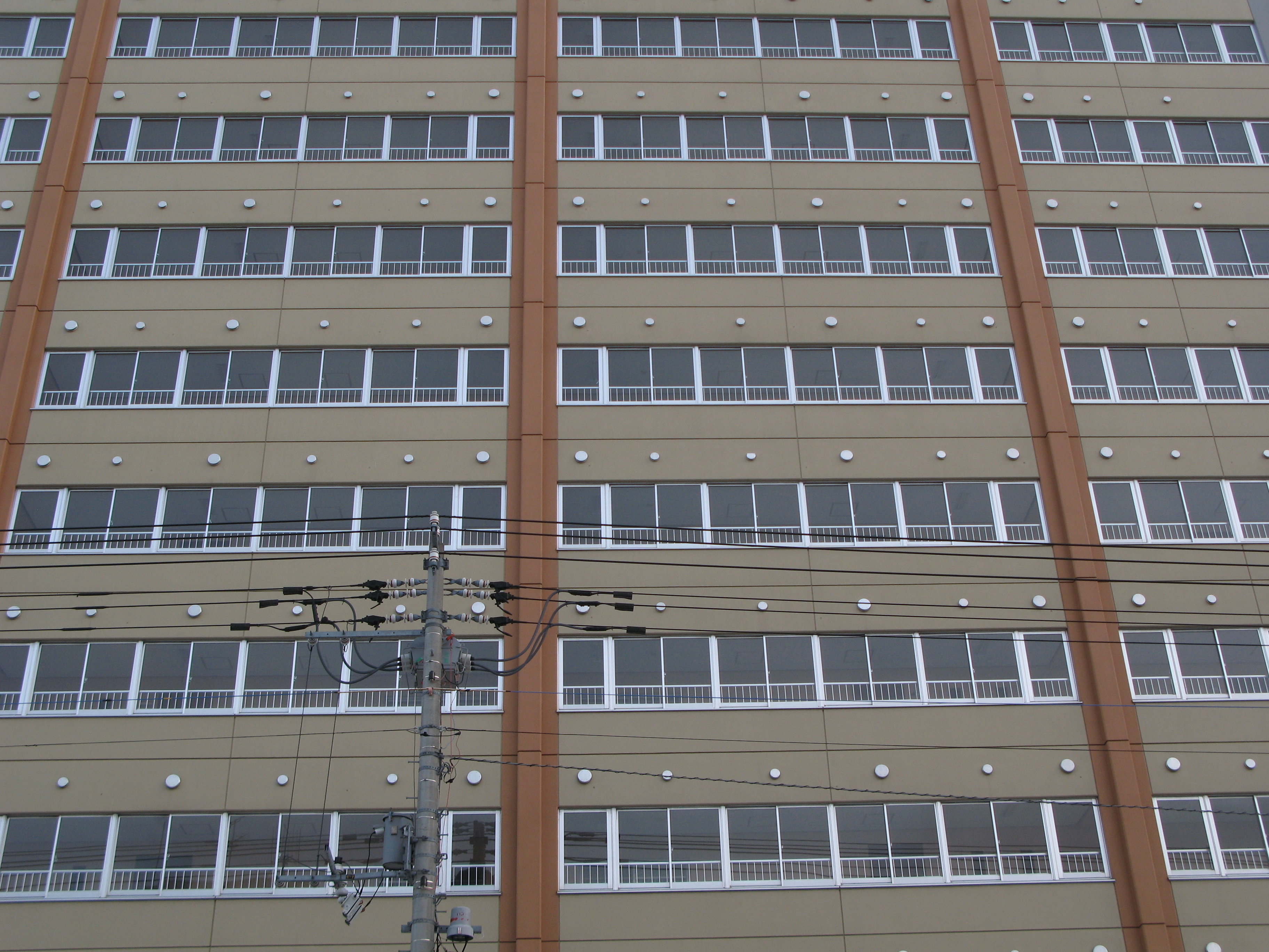 "bland frontage of a modern building with rows of identical windows and a power line infront"