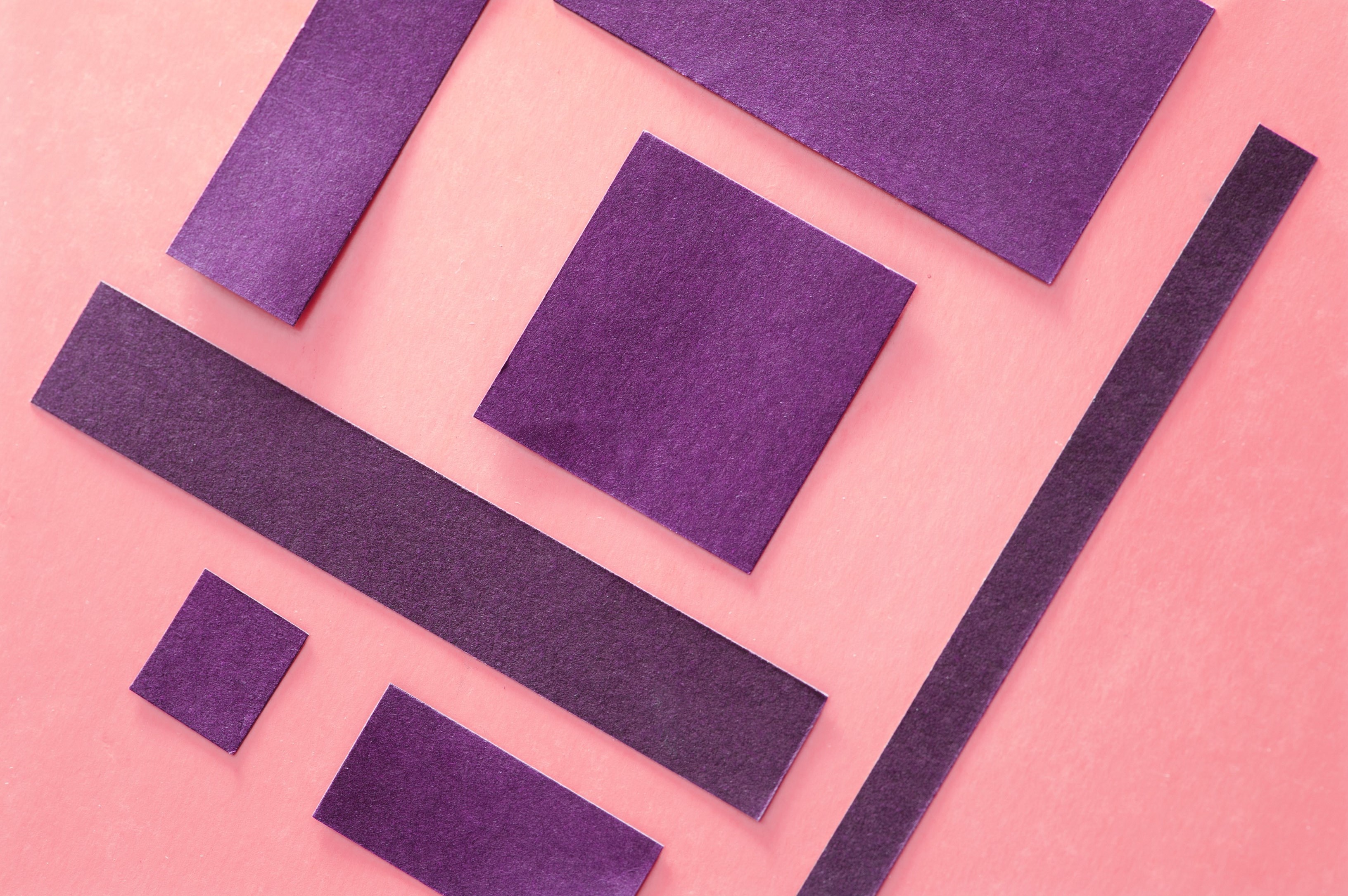 "oblique angled squares of paper on a pink background"