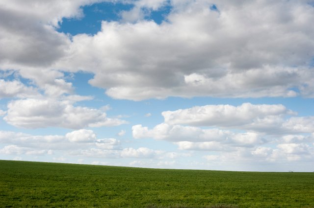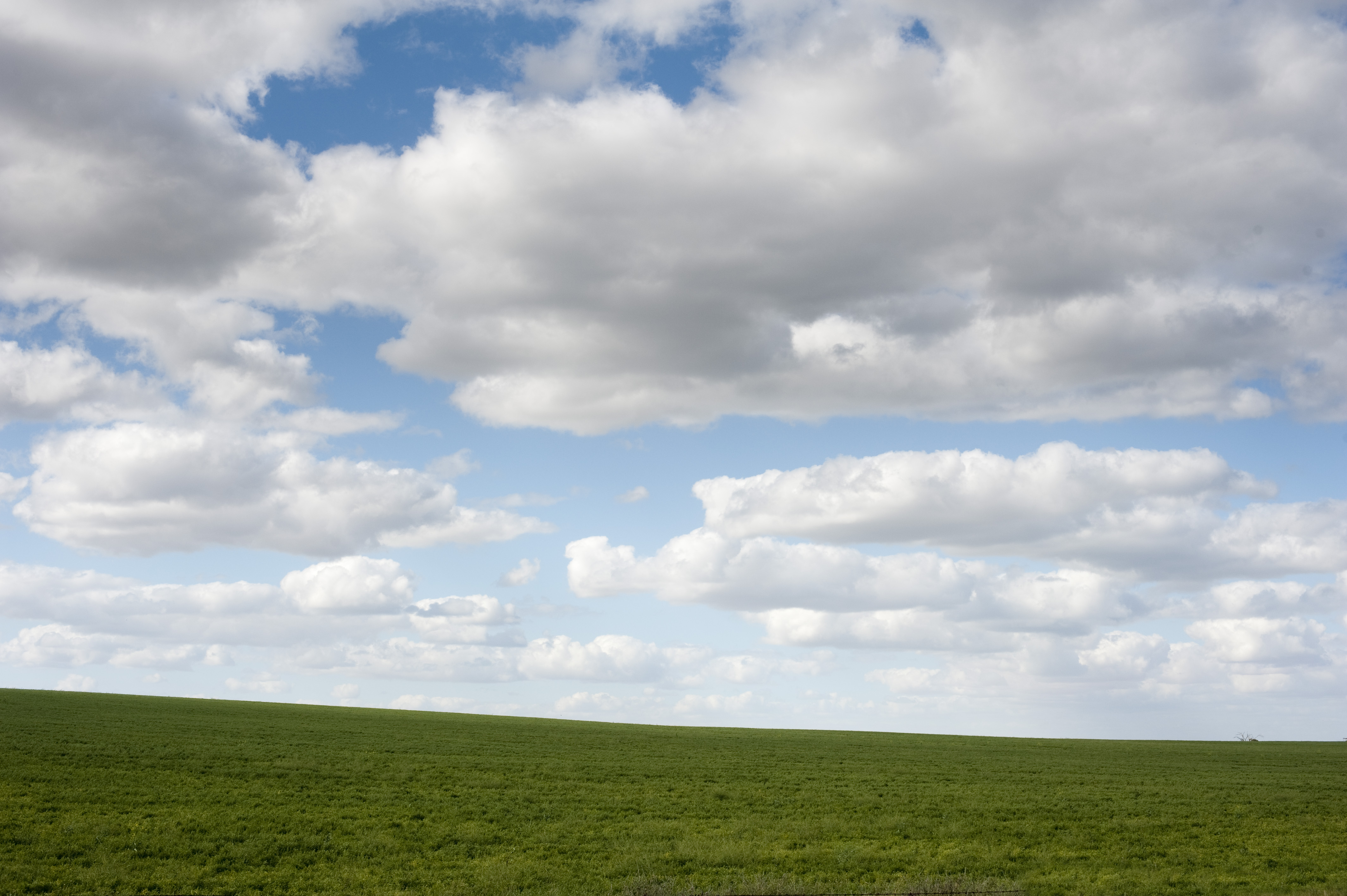 "a green earth foreground with blue cloudy sky above"
