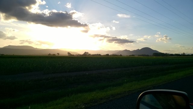 "dazzling clouded sunset viewed from a car window across a wide horizon"