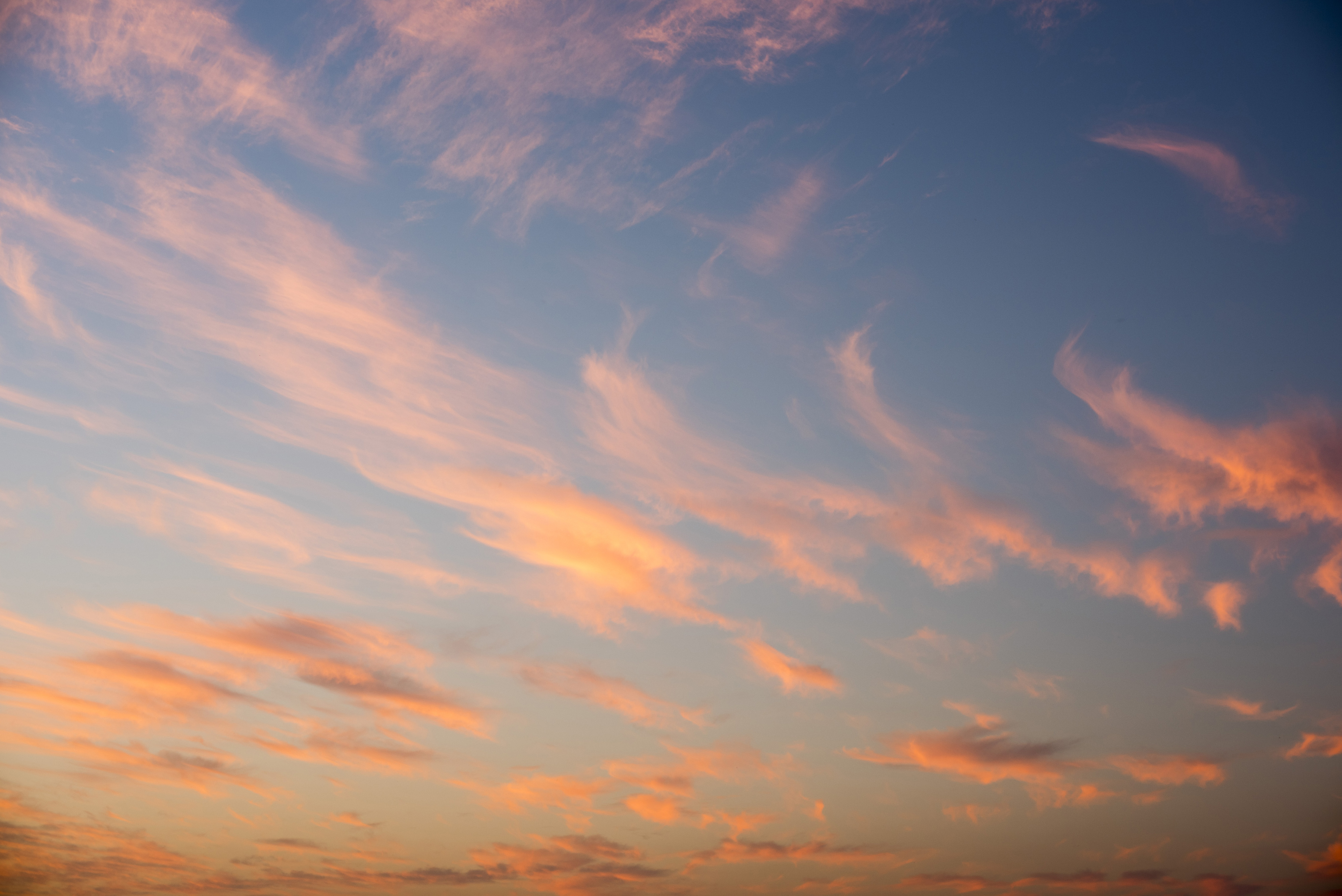 "pink orange glowing cirrus clouds forming a beautiful sunset sky"