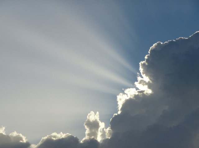"bright shafts of light emerging from a foreboding storm cloud"