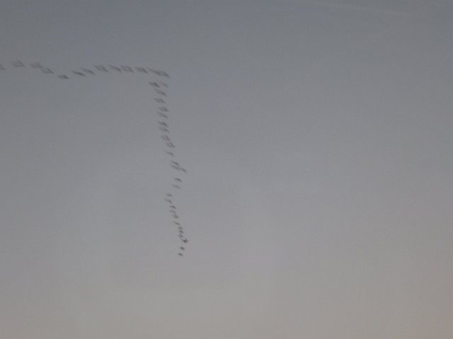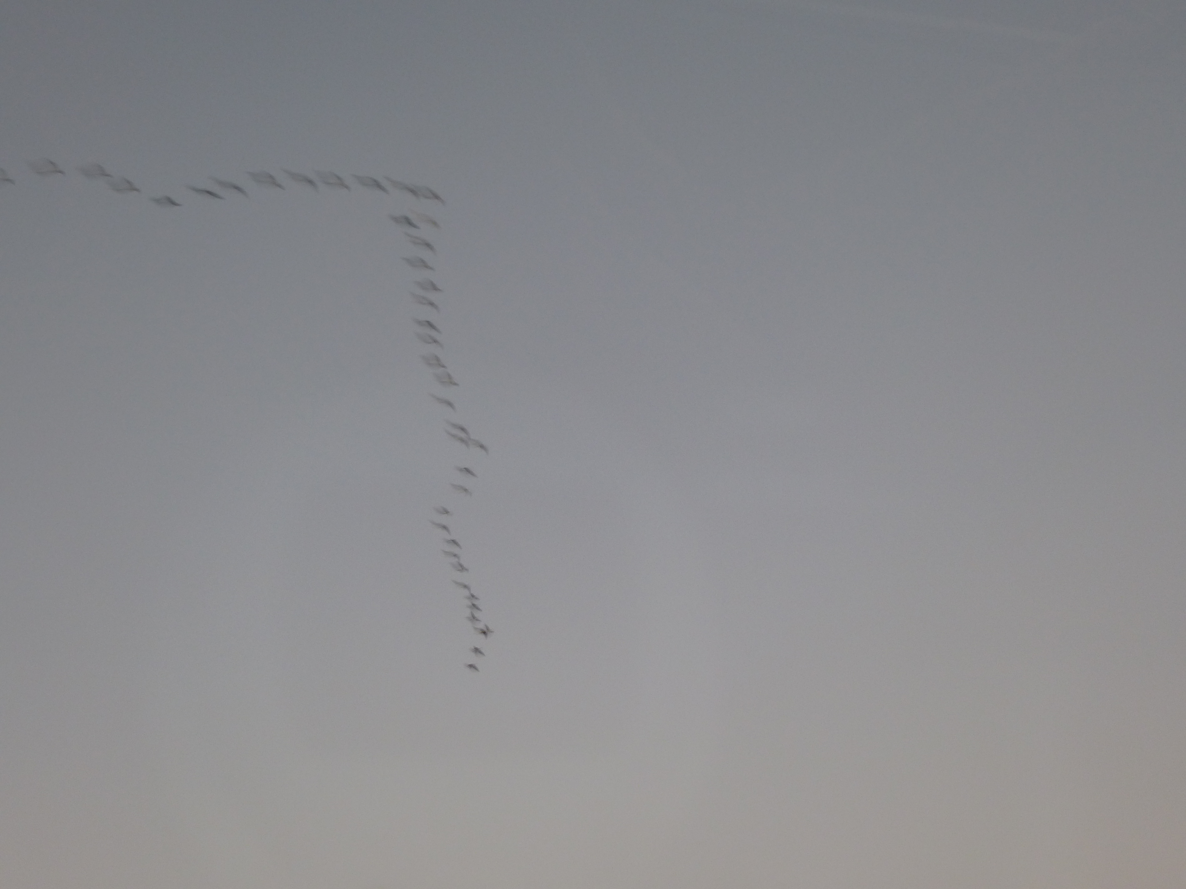 "a grey plain sky with a motion-blurred v formation of birds flying across it"