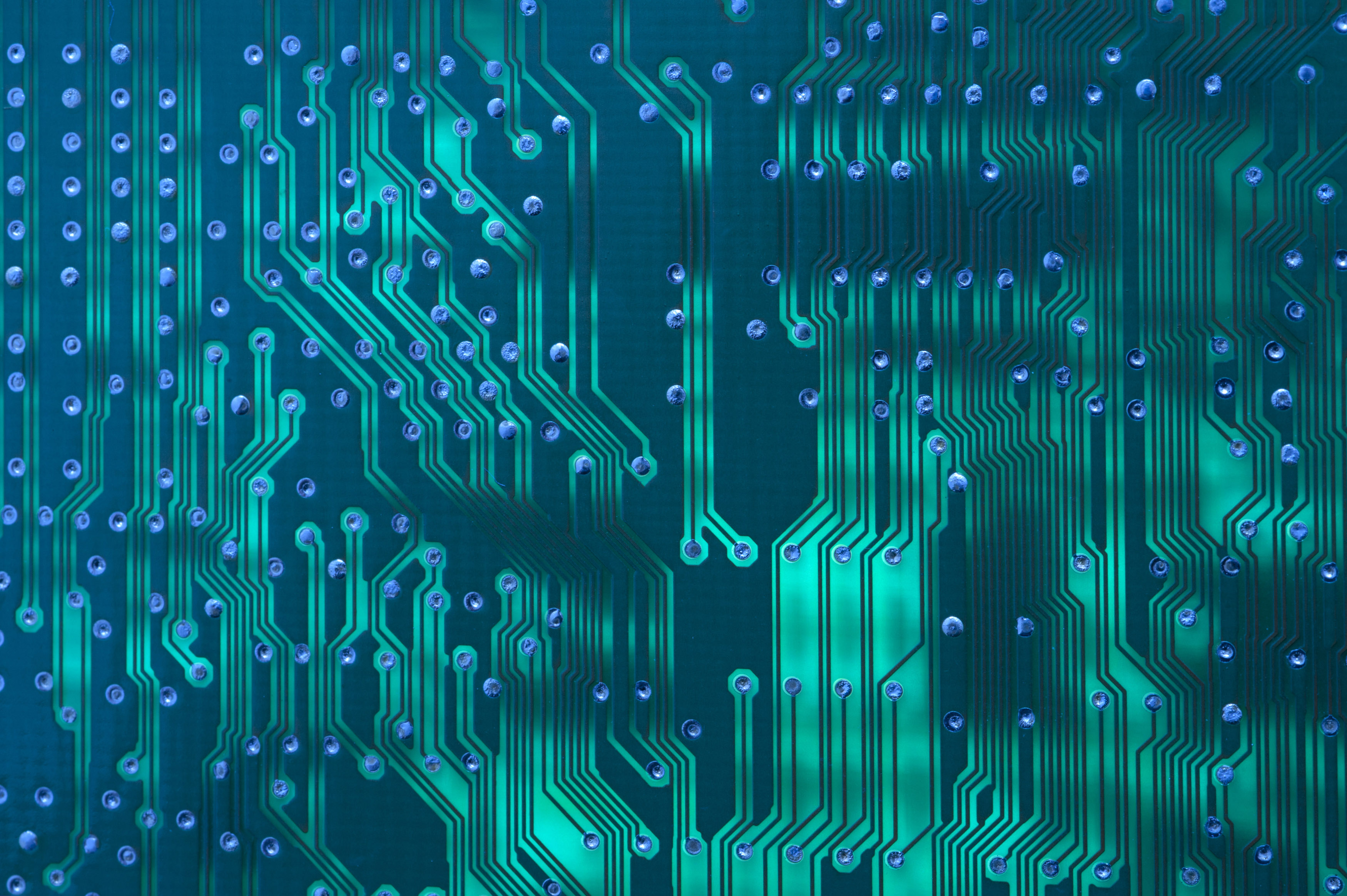 "Background pattern of blue electronic circuit tracks on a motherboard in a closeup full frame view"