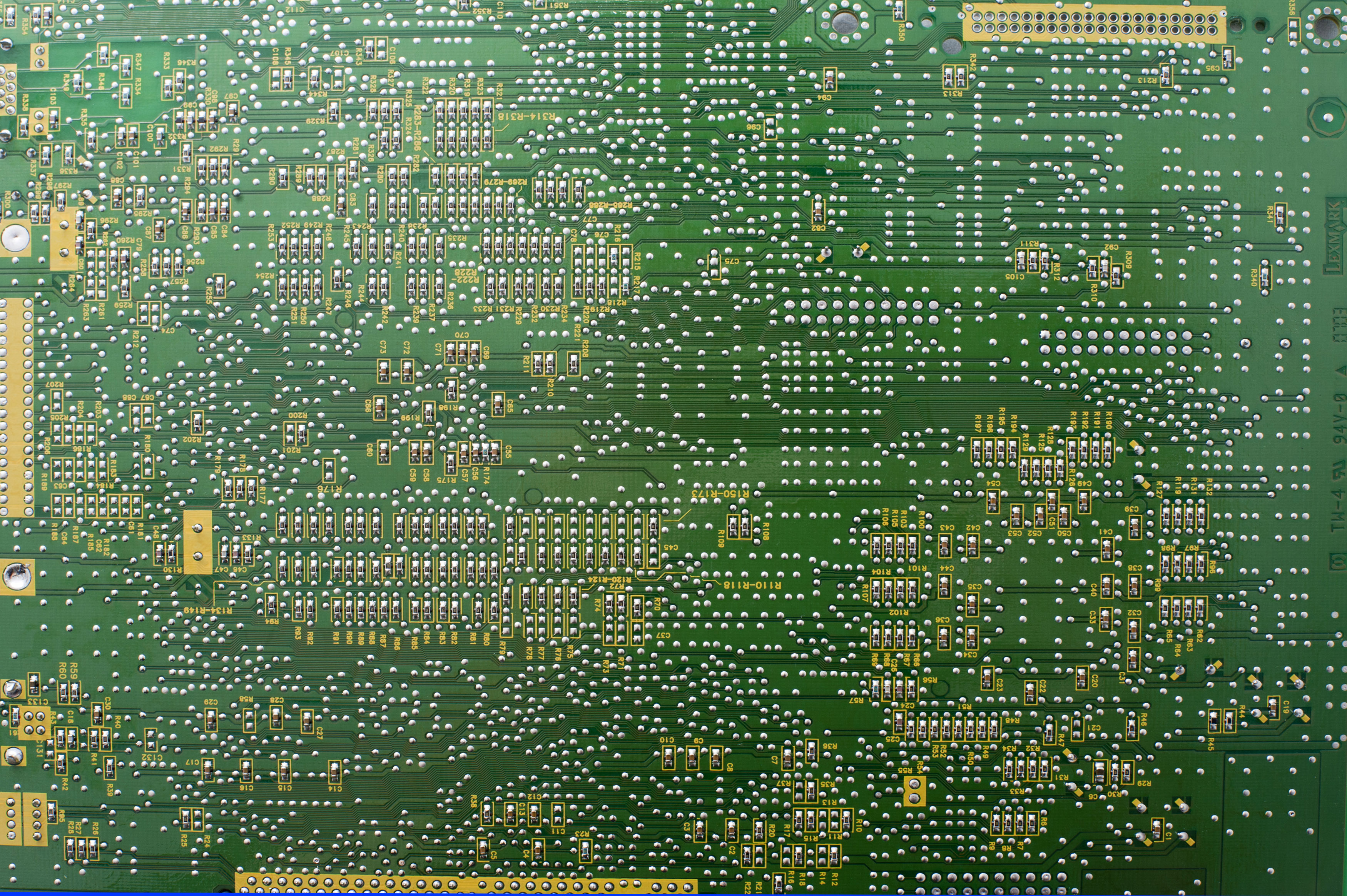 "Printed electronic circuit backdrop on green in a full frame view from above"