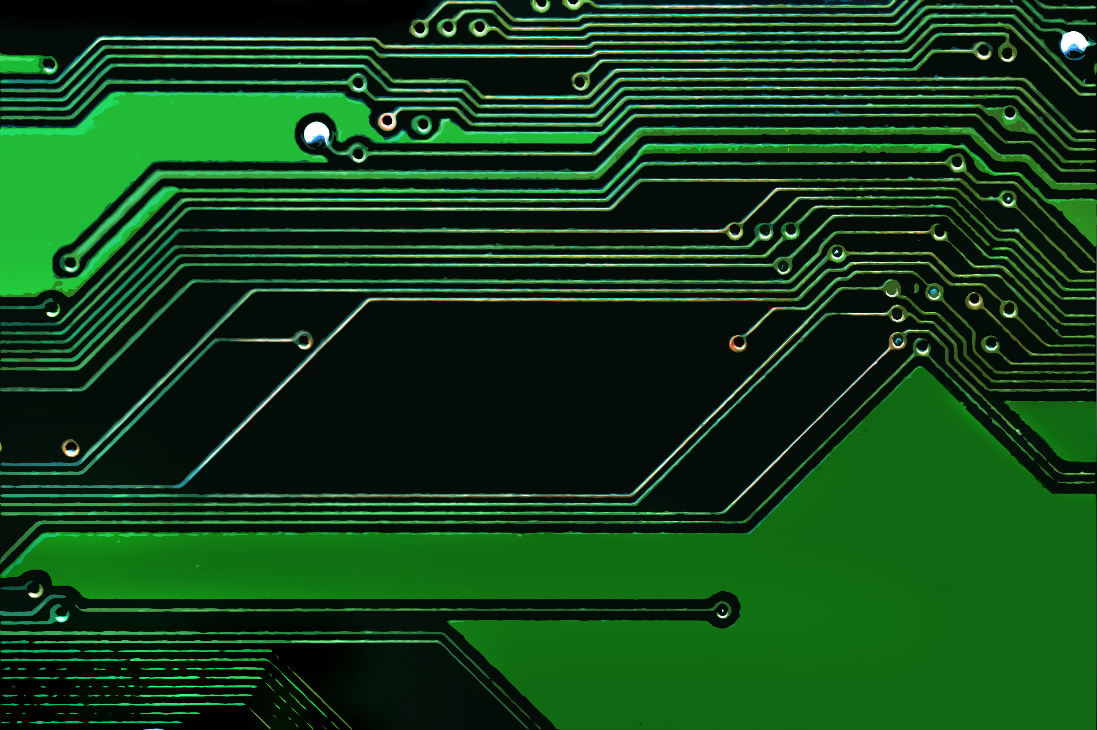 "Close up view of a diagonal electronic circuit on a colorful green background in a technology concept"