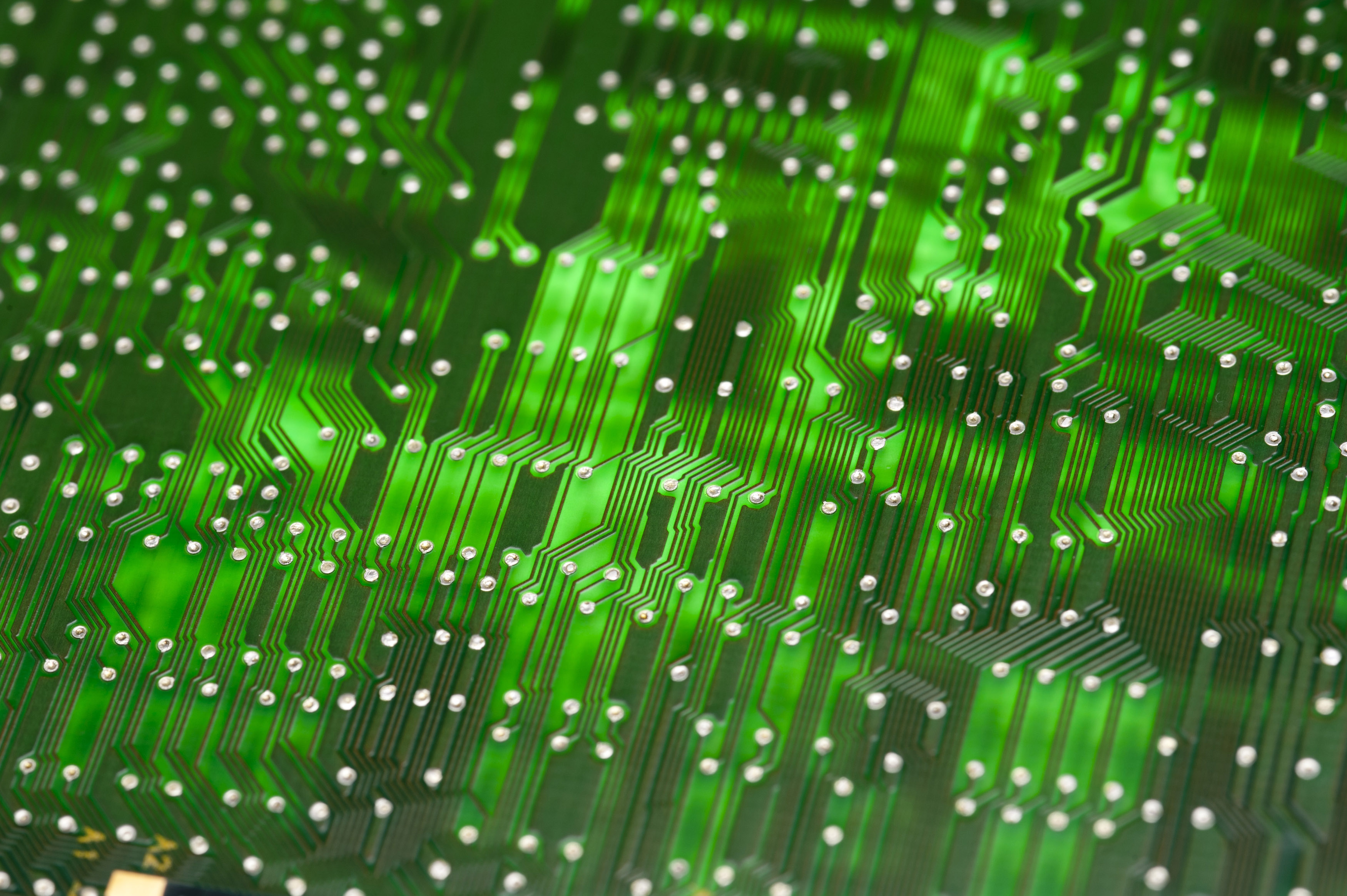 Green electronic circuit board glowing from inside, viewed in close-up selective focus and full frame for background concept