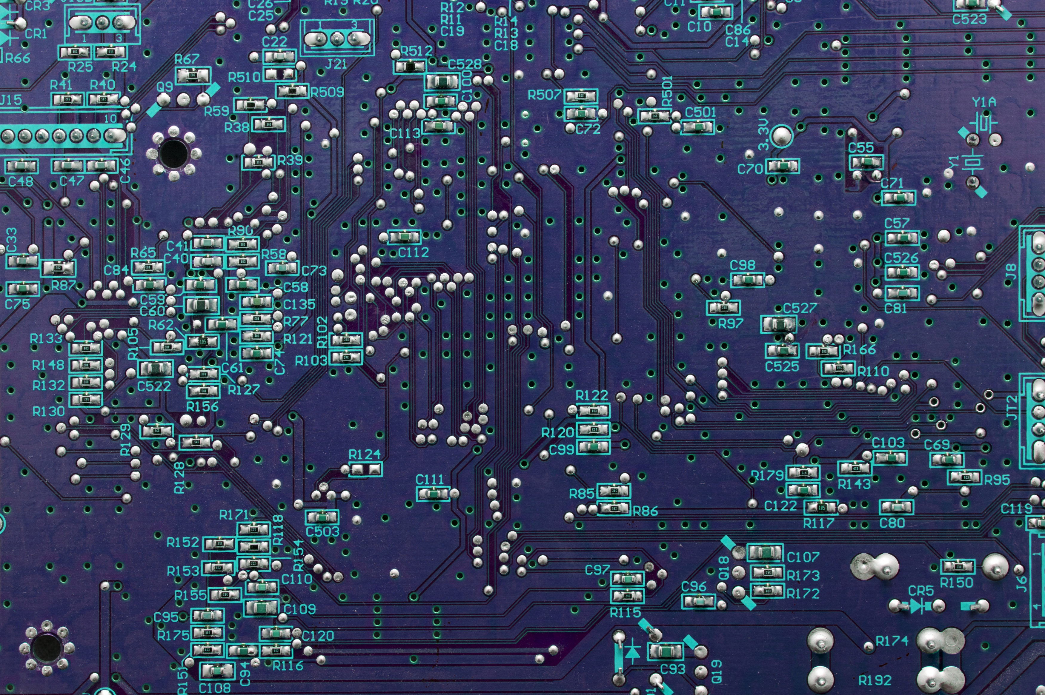 "Printed purple electronic circuit background with resistors, transistors, capacitors, inductors and diodes in close up detail"