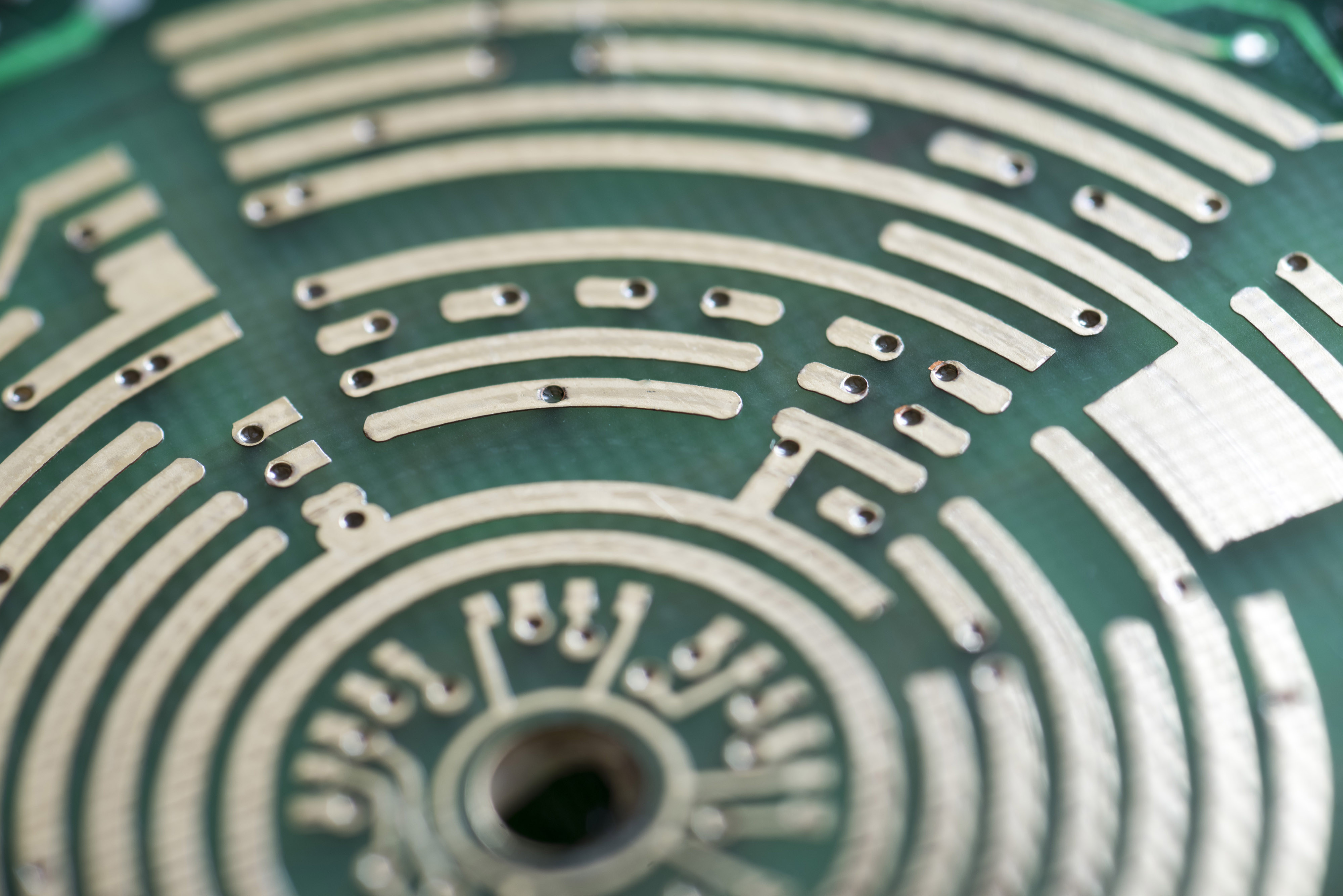 "curved concentric tracks traced on an electronic circuit card"
