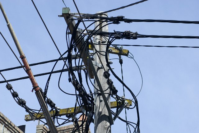 "a tangle of cables on an urban power pole"