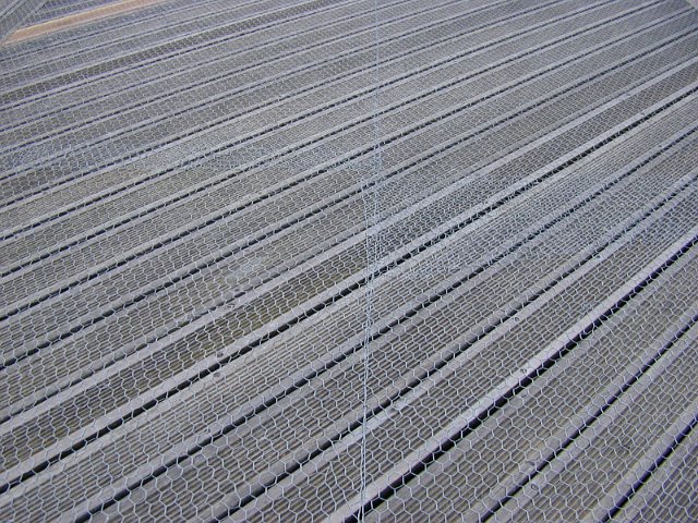 "wooden decking with chicken wire"