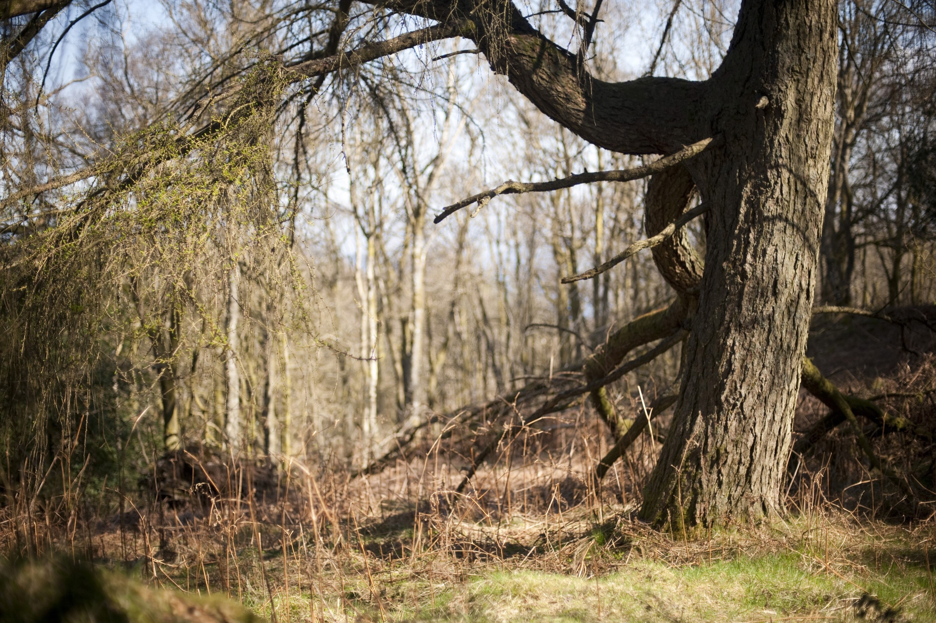 "Beautiful ethereal woodland with an old tree trunk in a grassy clearing and a view to trees beyond"