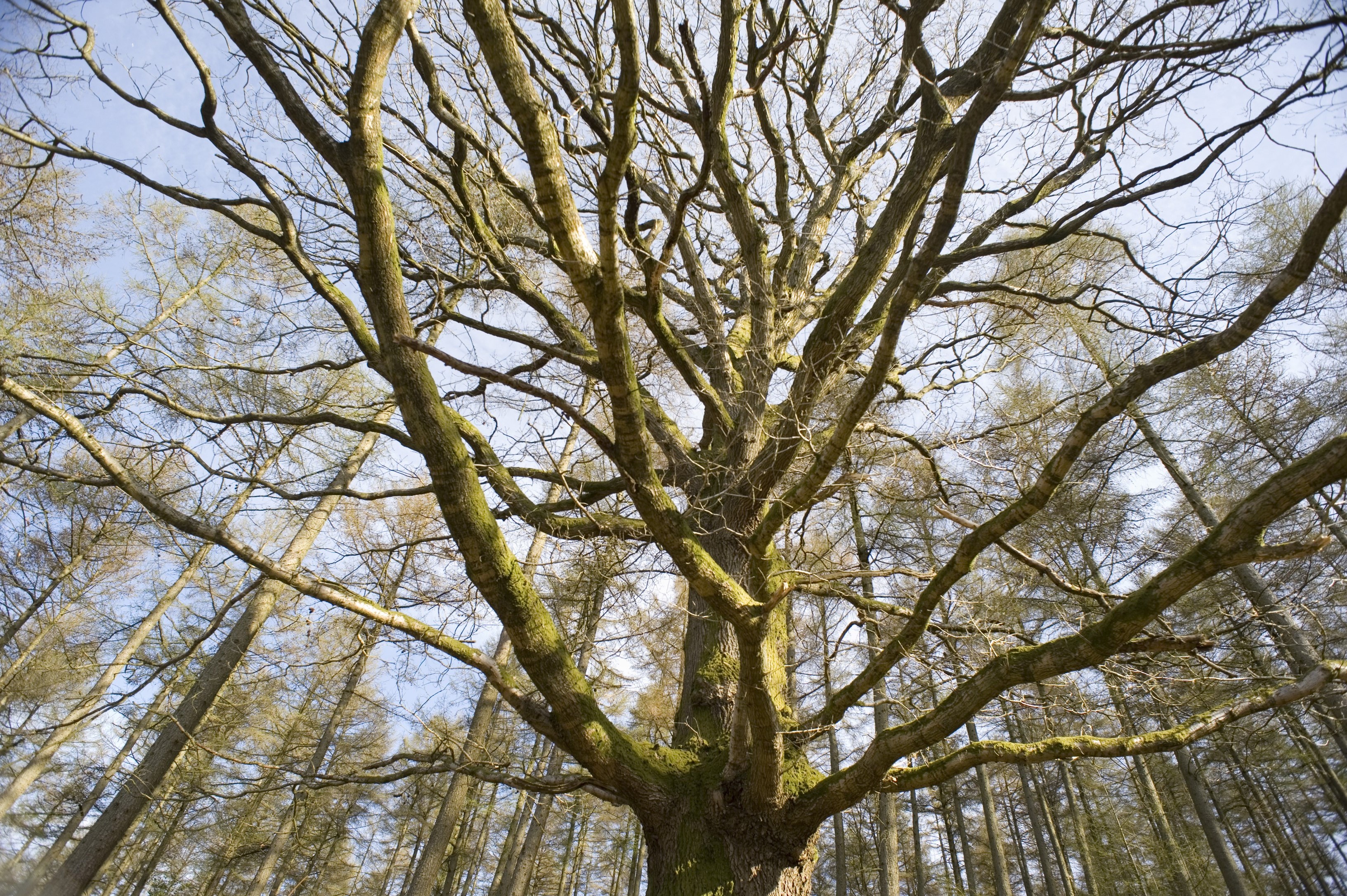 "Wide angle view of the spreading bare branches of a large deciduous tree in woodland"