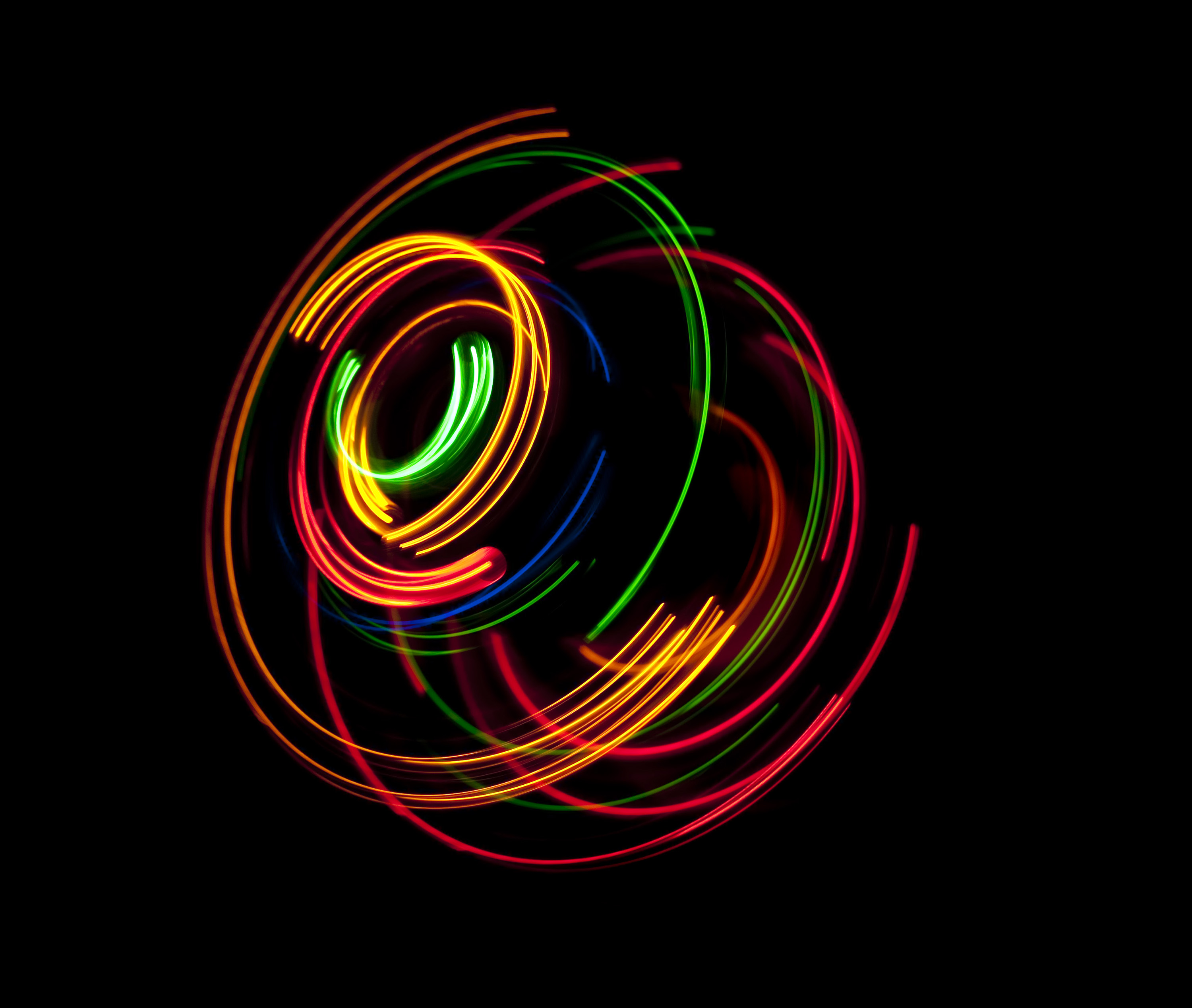 "a colorful pattern of rotating lights plotting sweeping arcs around a central point"