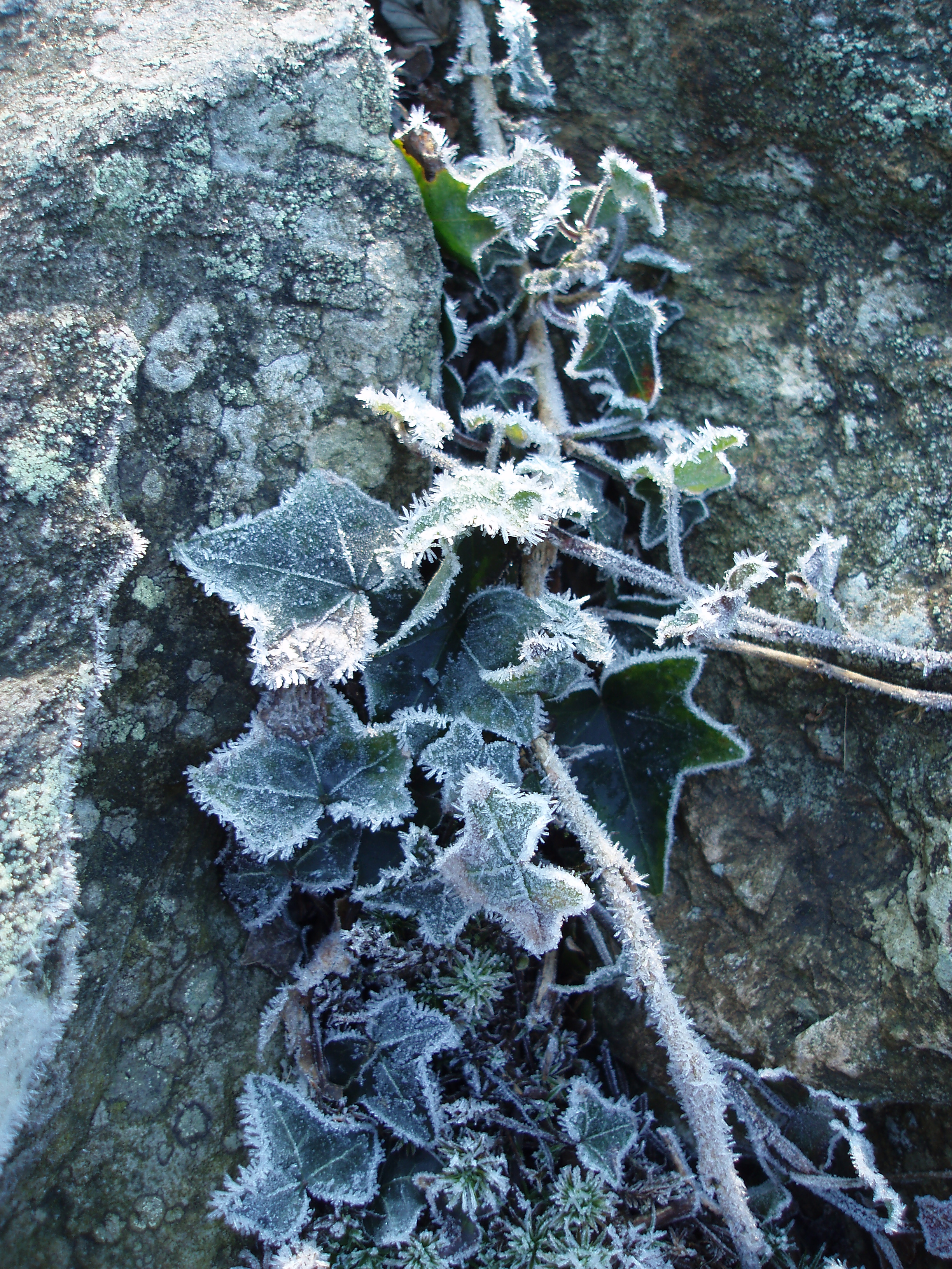 "ivy and rock covered in winter frost"