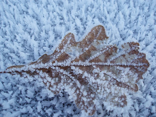 "frost covered brown fallen oak leaf on a bed of more frost cryatals"