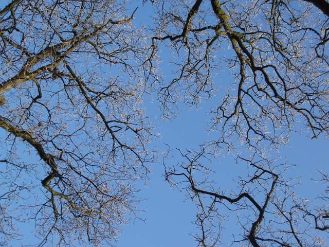 "looking up at frosty tree with blue sky background"