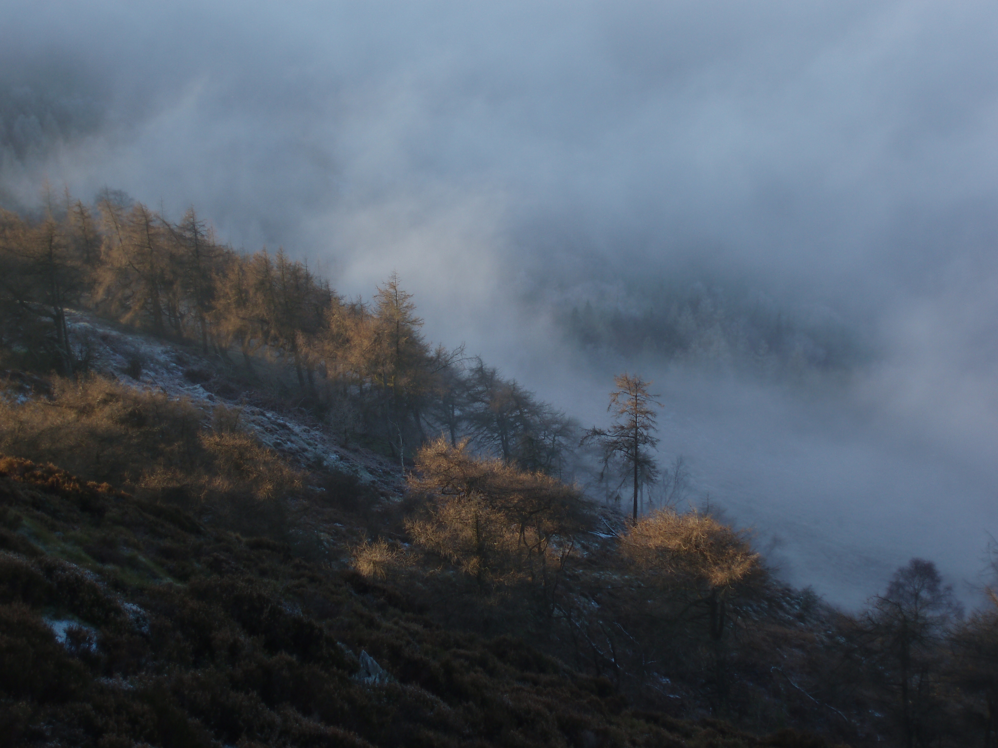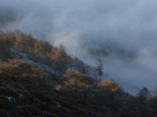 "cold misty winter landscape on a steep hillside looking down to a fog filled valley below"