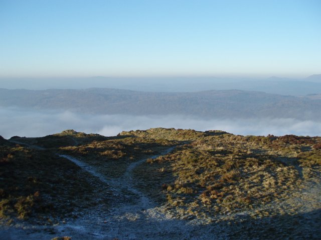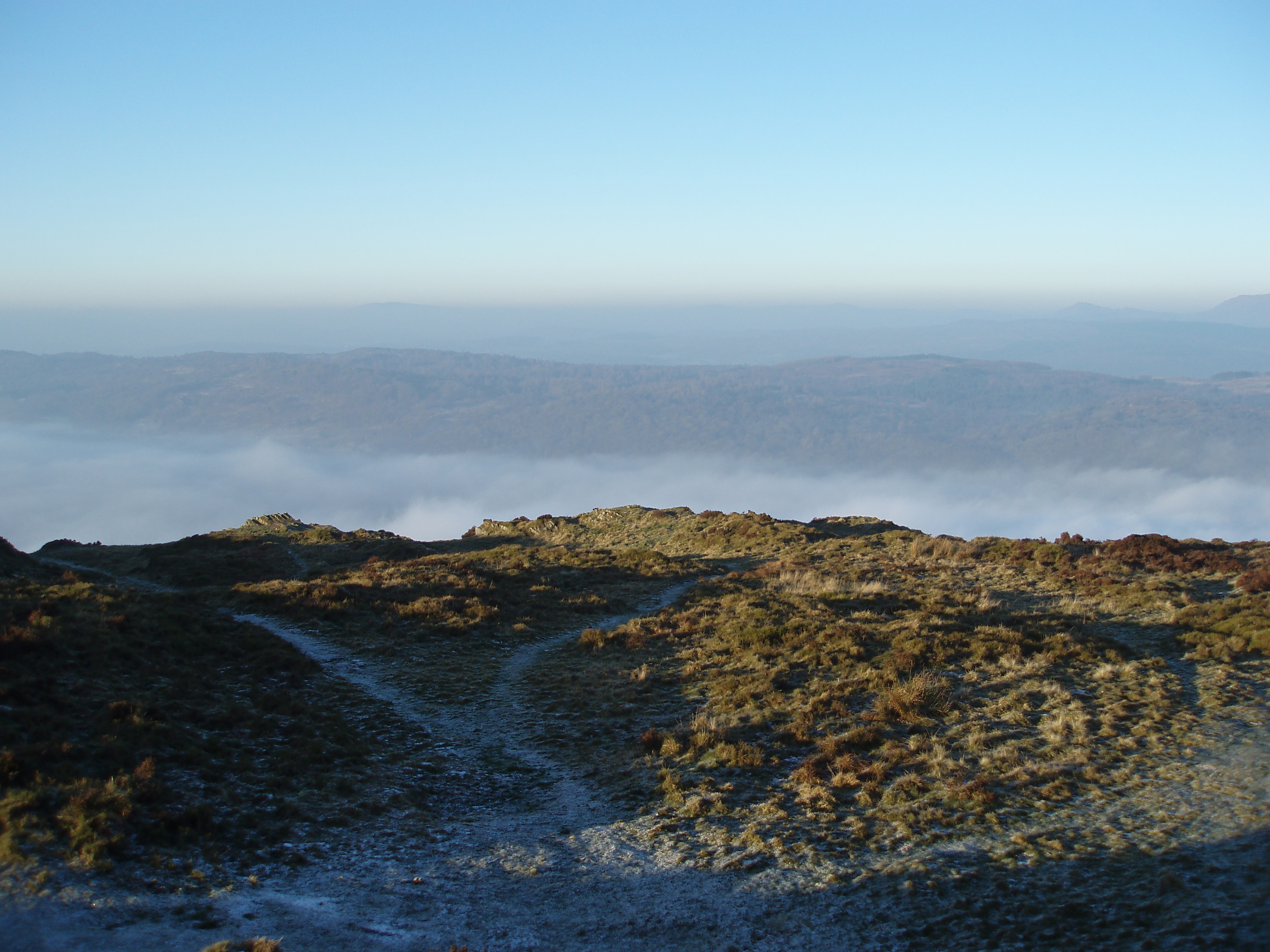 "cumbria winter, low advection fog filling the valleys below"